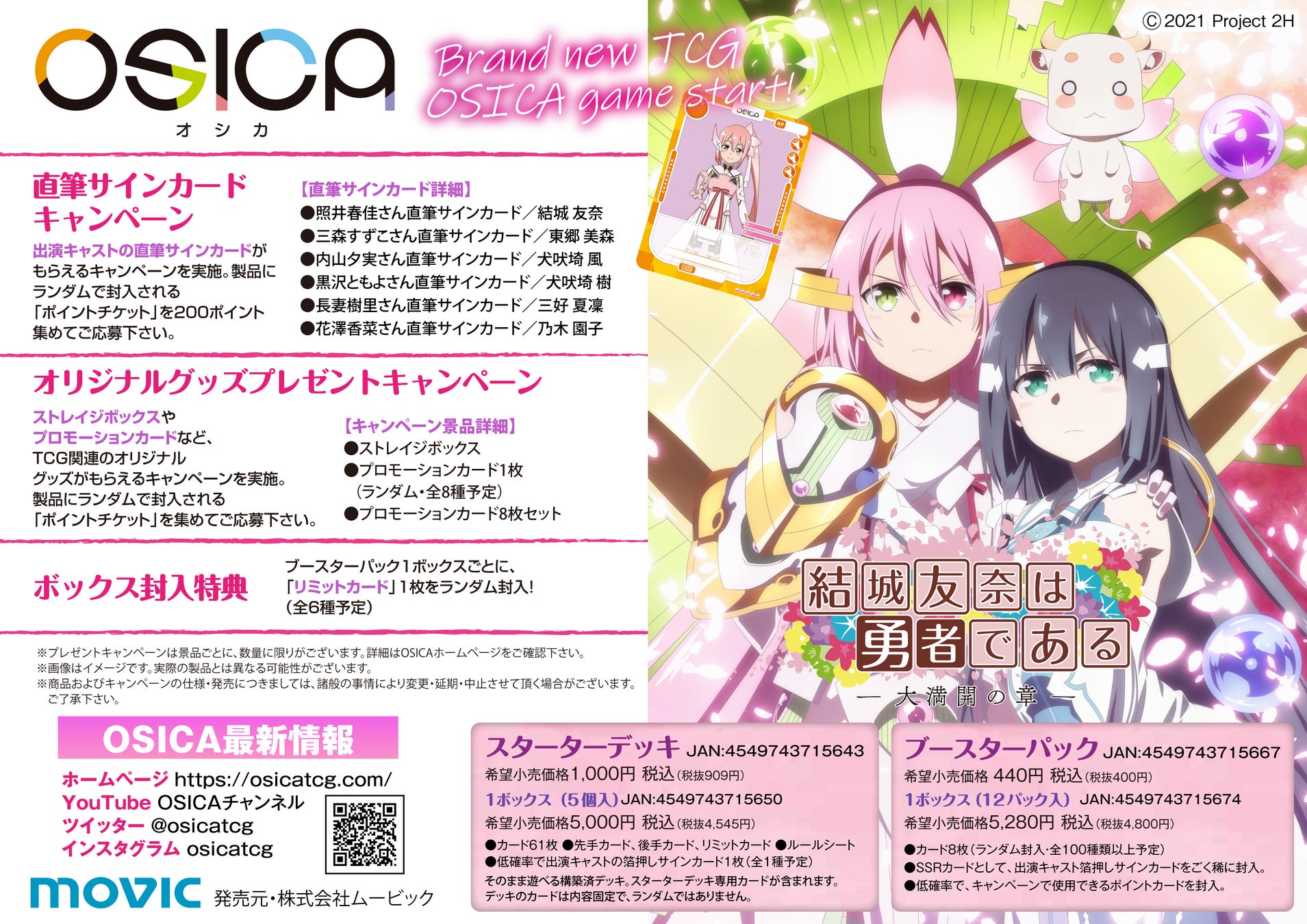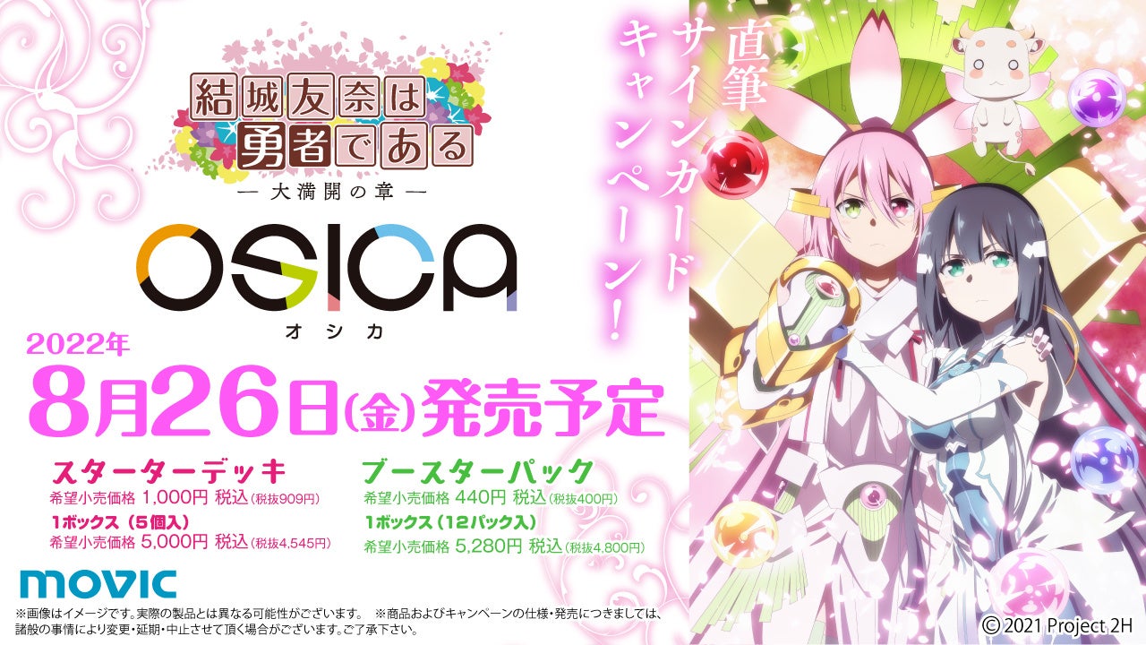 株式会社ムービック(本社:東京都豊島区、代表:國枝信吾)から、人気アニメやゲームなどを題材とした新作トレーディングカードゲーム(以下、TCG)、「OSICA(オシカ)」が発売。「自分の推しキャラで相手のハートを奪う」。作品・キャラクターへの愛を何より大切にした新しいカードゲーム。其の第3弾「結城友奈は勇者である -大満開の章-」が2022年8月26日に発売決定しました。