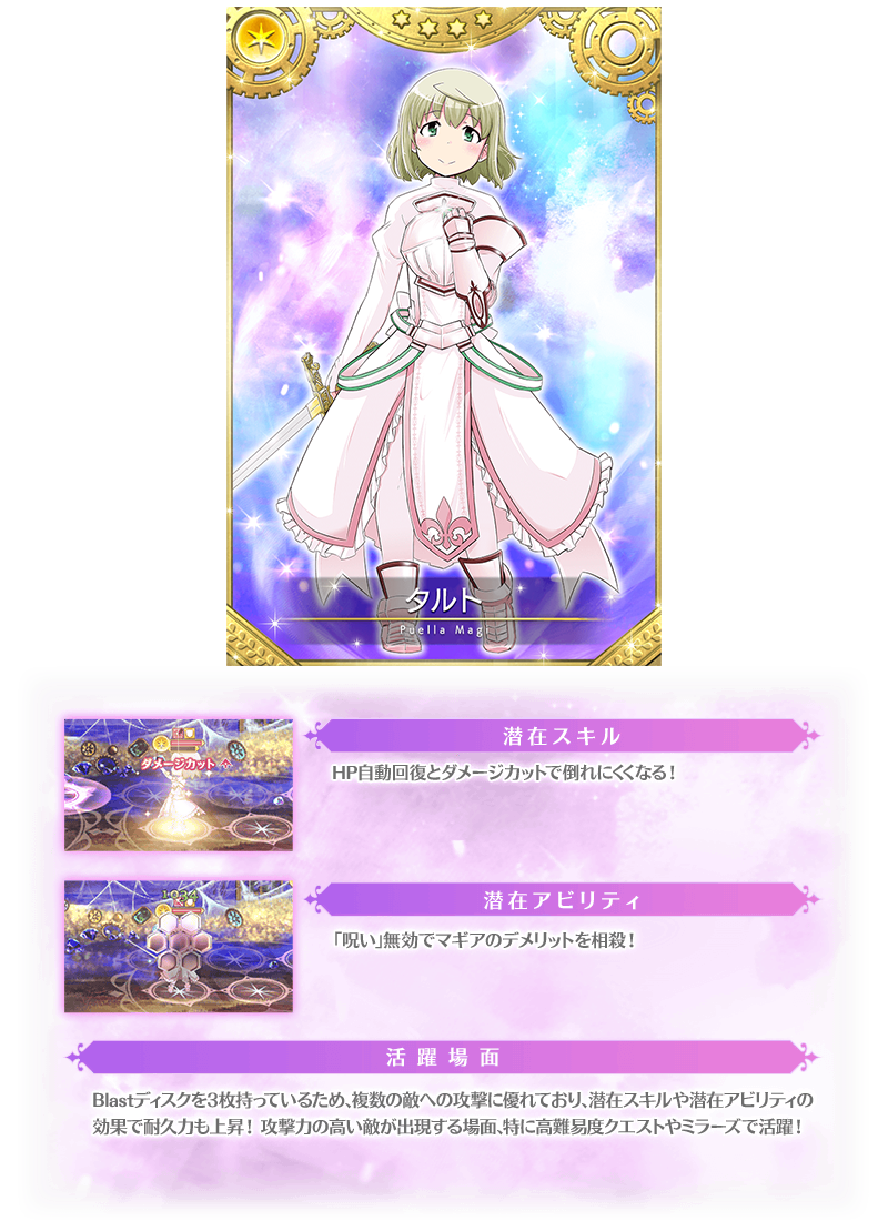 『期間限定 タルト ピックアップガチャ』では下記ピックアップ対象の魔法少女およびメモリアの提供割合がアップしております。