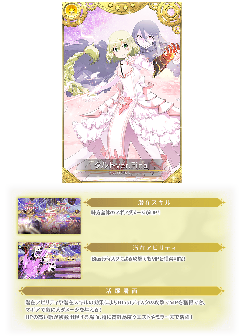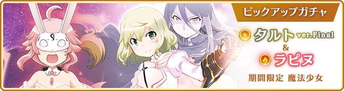 『期間限定 タルトver.Final&ラピヌ ピックアップガチャ』では下記ピックアップ対象の魔法少女およびメモリアの提供割合がアップしております。