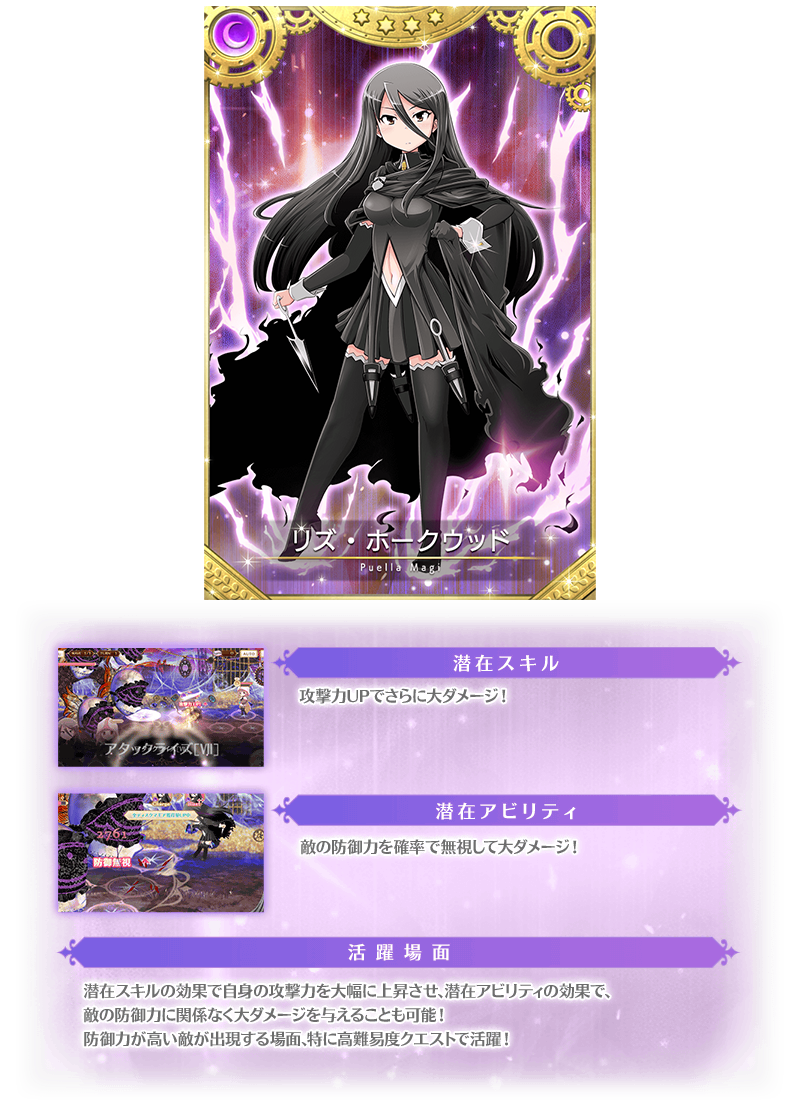本ガチャより、魔法少女「リズ」とメモリア「第3の魔法少女」「寄り添う影と光」が期間限定で登場いたします。