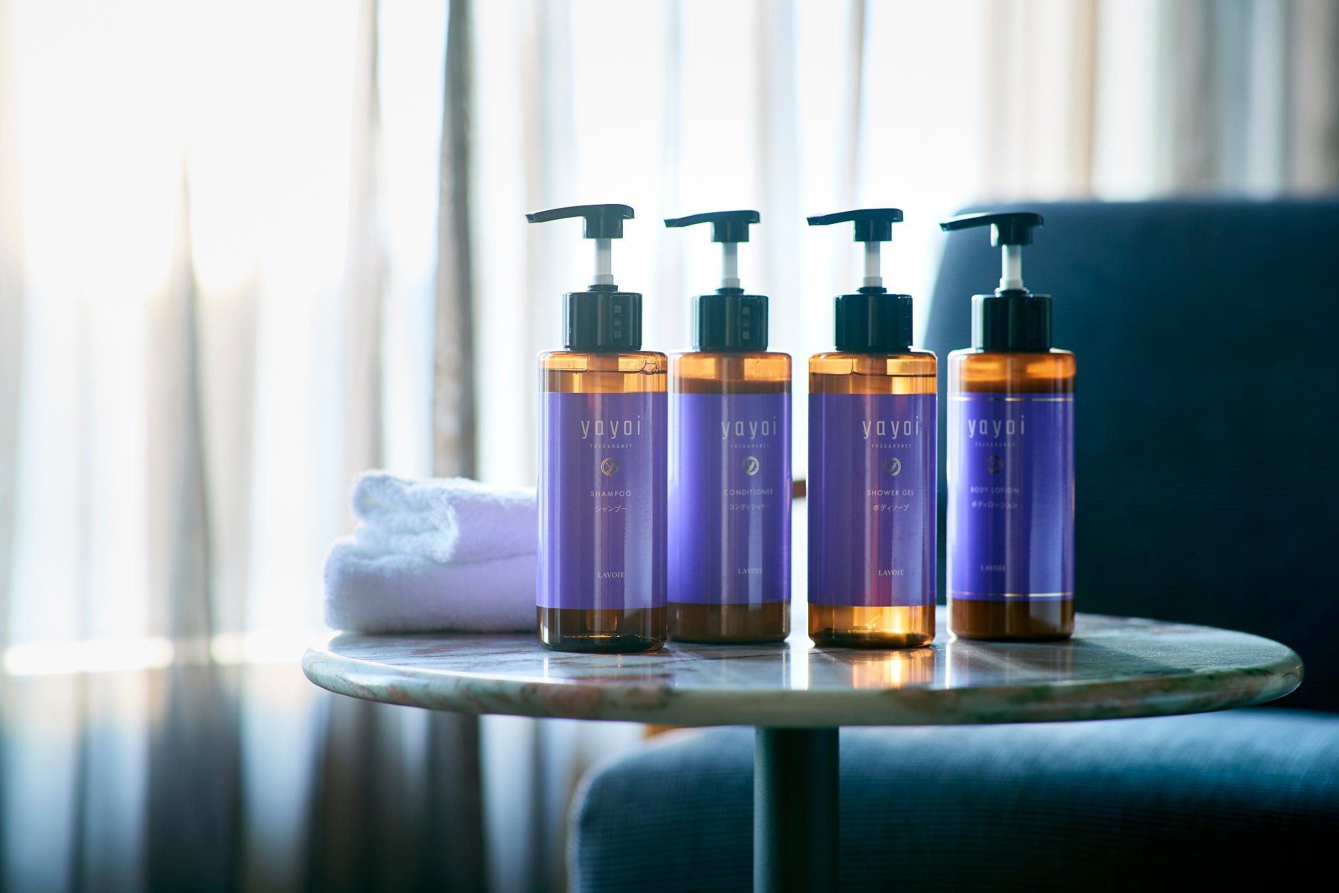 また、バスアメニティには、パラベン、シリコン不使用で低刺激のナチュラルビューティーブランド「yayoi」のシャンプー、コンディショナー、ボディソープ、ボディローションをボトルポンプ式でご用意。タオル・バスローブは日本が世界に誇る「今治タオル」を、ルームウェアには保温性・吸湿性・発散性に富み、肌触りのよい安全性の高いガーゼを透けないように交織二重ヘリンボン柄に織り上げた「リラックスウェア」をご用意しました。