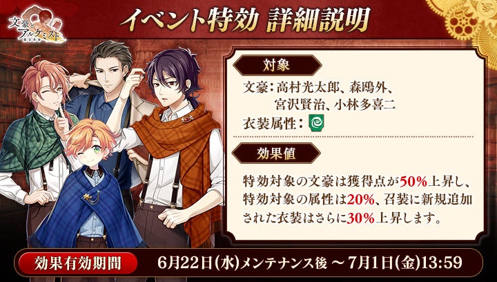 期間中「高村光太郎」「森鴎外」「宮沢賢治」「小林多喜二」の衣装を編成して潜書すると、得点の獲得数がそれぞれ50%上昇します。また、「風」属性の衣装を編成して潜書すると、得点の獲得数がそれぞれ20%上昇します。