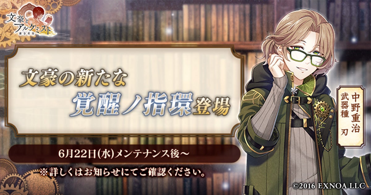 合同会社EXNOA(本社:東京都港区、CEO:村中 悠介、URL:https://games.dmm.com/)が運営するDMM GAMESは、6月22日(水)より、女性向け文豪転生シミュレーションゲーム「文豪とアルケミスト」において、中野重治の新たな「覚醒ノ指環」が登場いたしました。