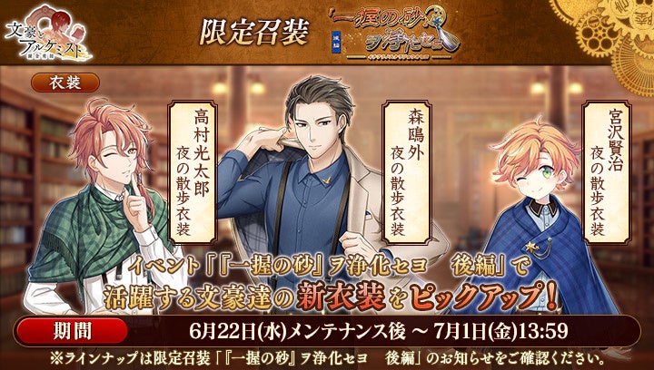 さらに、イベントと同時に開催される限定召装「『一握の砂』ヲ浄化セヨ 後編」にて新規追加された「高村光太郎」「森鴎外」「宮沢賢治」の〈夜の散歩衣装〉を編成すると、得点の獲得率がそれぞれ30%上昇します。