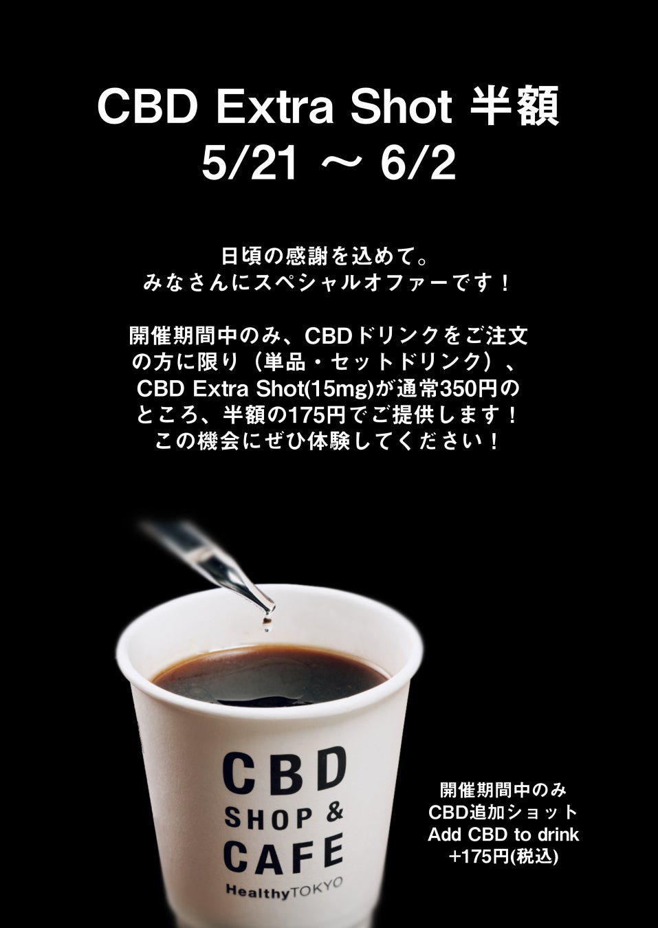 CBDドリンクをご注文の方(単品・セットドリンク)限定で、通常15mgで税込350円の CBD Extra Shot を、半額の税込175円でご提供いたします。
