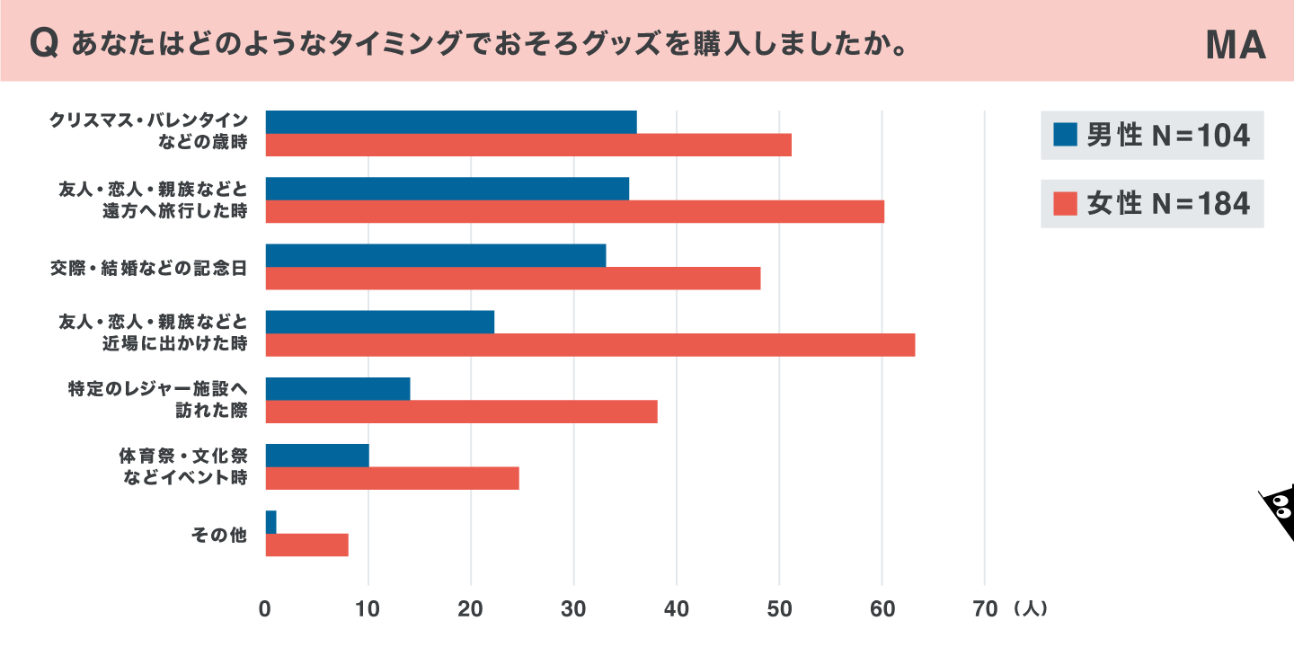 おそろグッズを「持っている」と回答した方に購入した理由を尋ねたところ、「気に入ったアイテム・デザイン(56.9%)」、「思い出作り(55.9%)」が回答の大多数を占めました。さらに購入タイミングを尋ねると、女性は60%以上が外出時(「お出かけした時(34.2%)」、「旅行した時(32.6%)」、「レジャー施設へ訪れた時(20.7%)」)に購入しており、おそろグッズを持っている理由も踏まえ、女性は「思い出づくり」としておそろグッズを購入することが多いと考えられます。