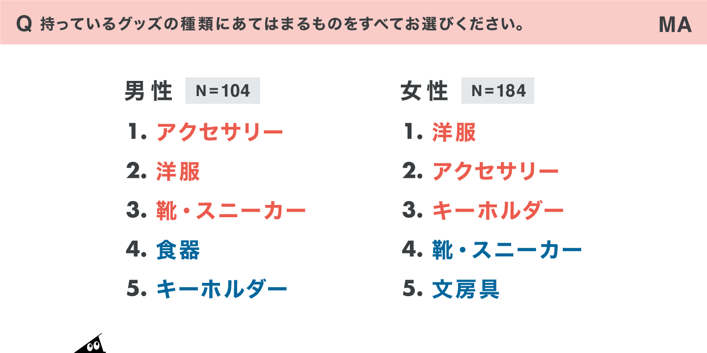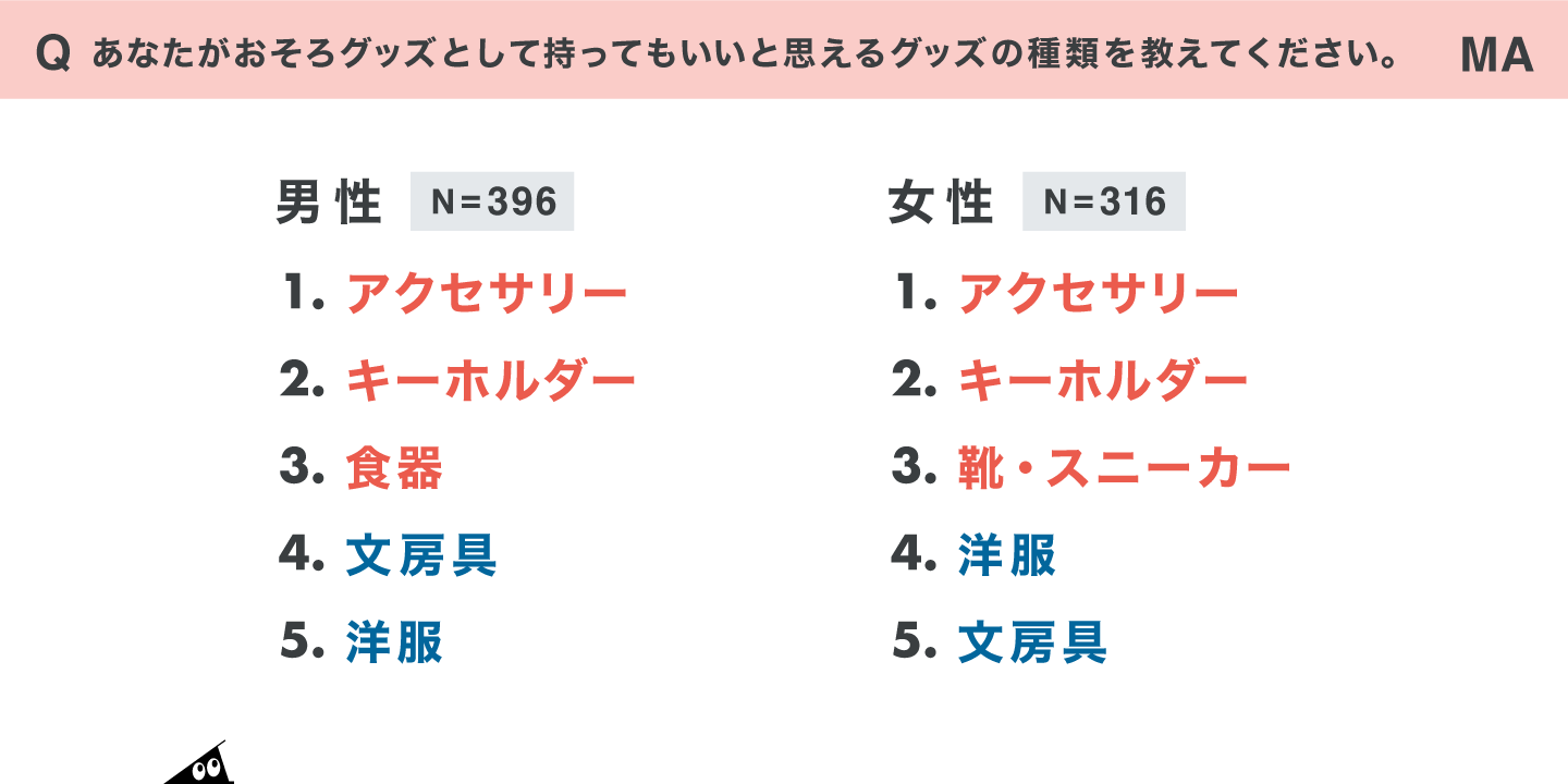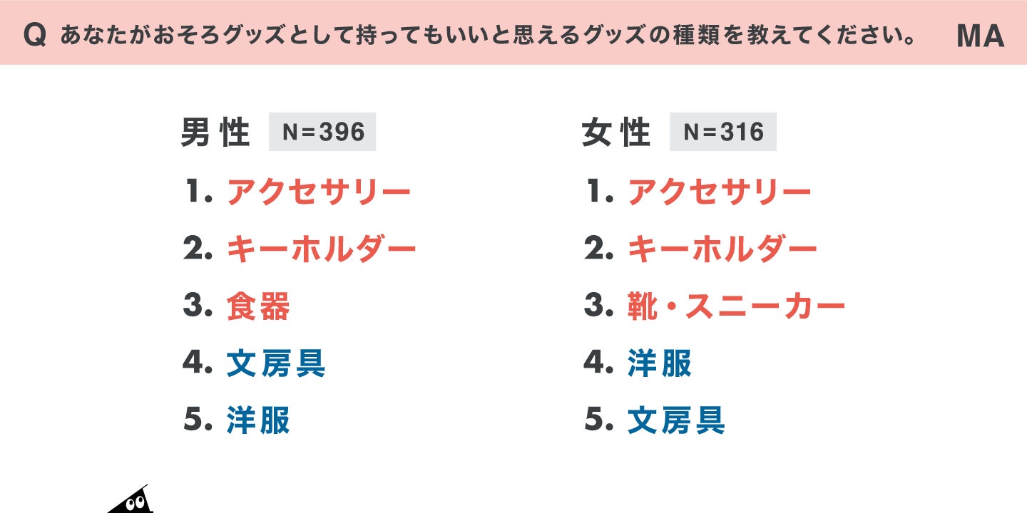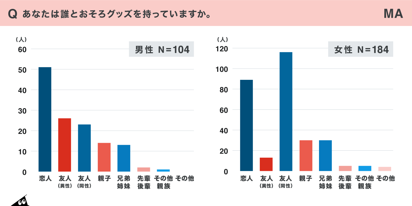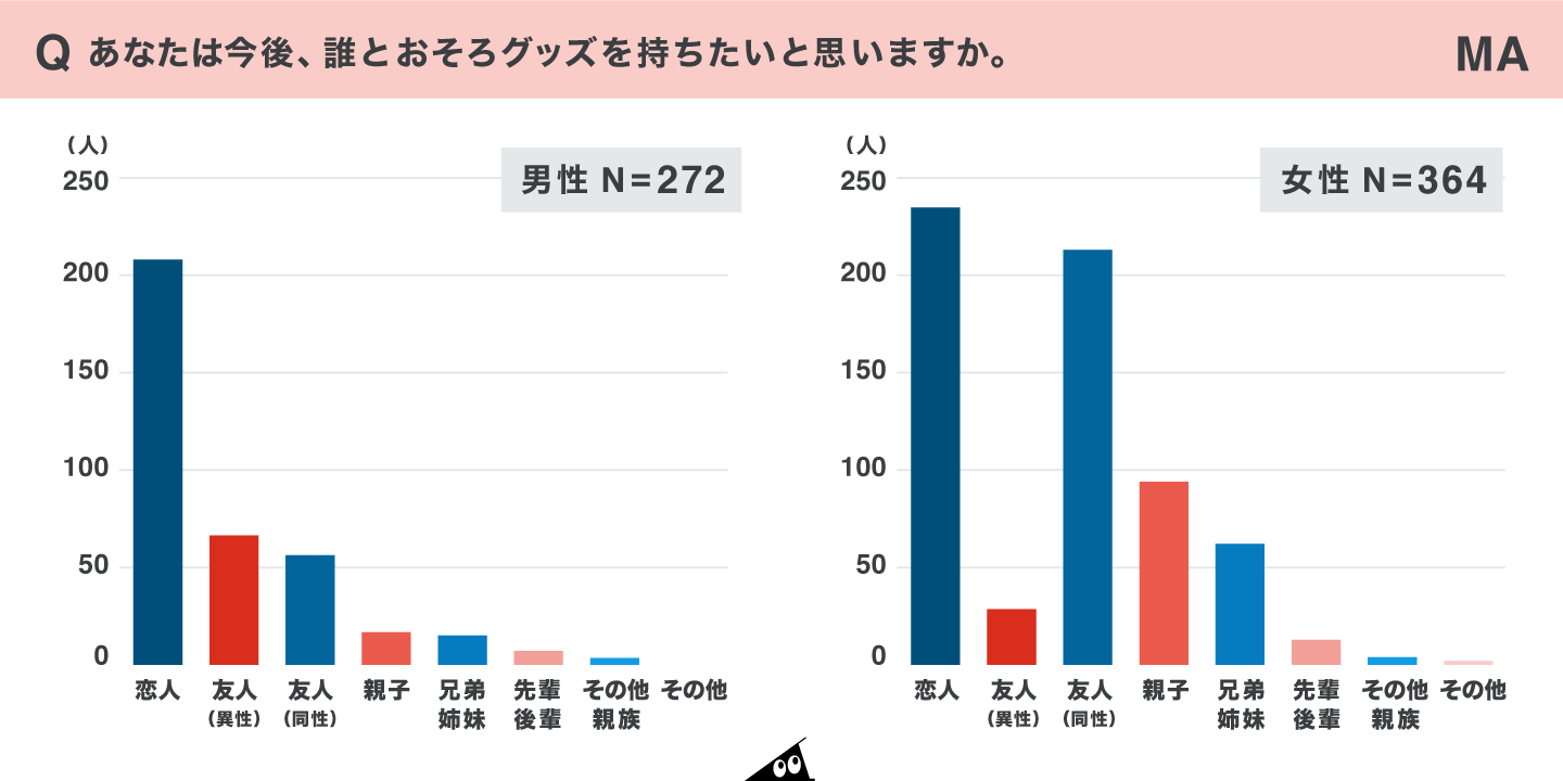 今後おそろグッズを持ちたい人のうち、男女ともに約70%が「恋人・パートナー(男性:77.6%、女性:65.4%)」と回答しました。女性は「同性の友人(59.3%)」に次いで「親子(25.3%)」や「兄弟・姉妹(17.3%)」との回答も目立ち、さまざまな人とおそろグッズを持ちたいと考えていることが窺えます。