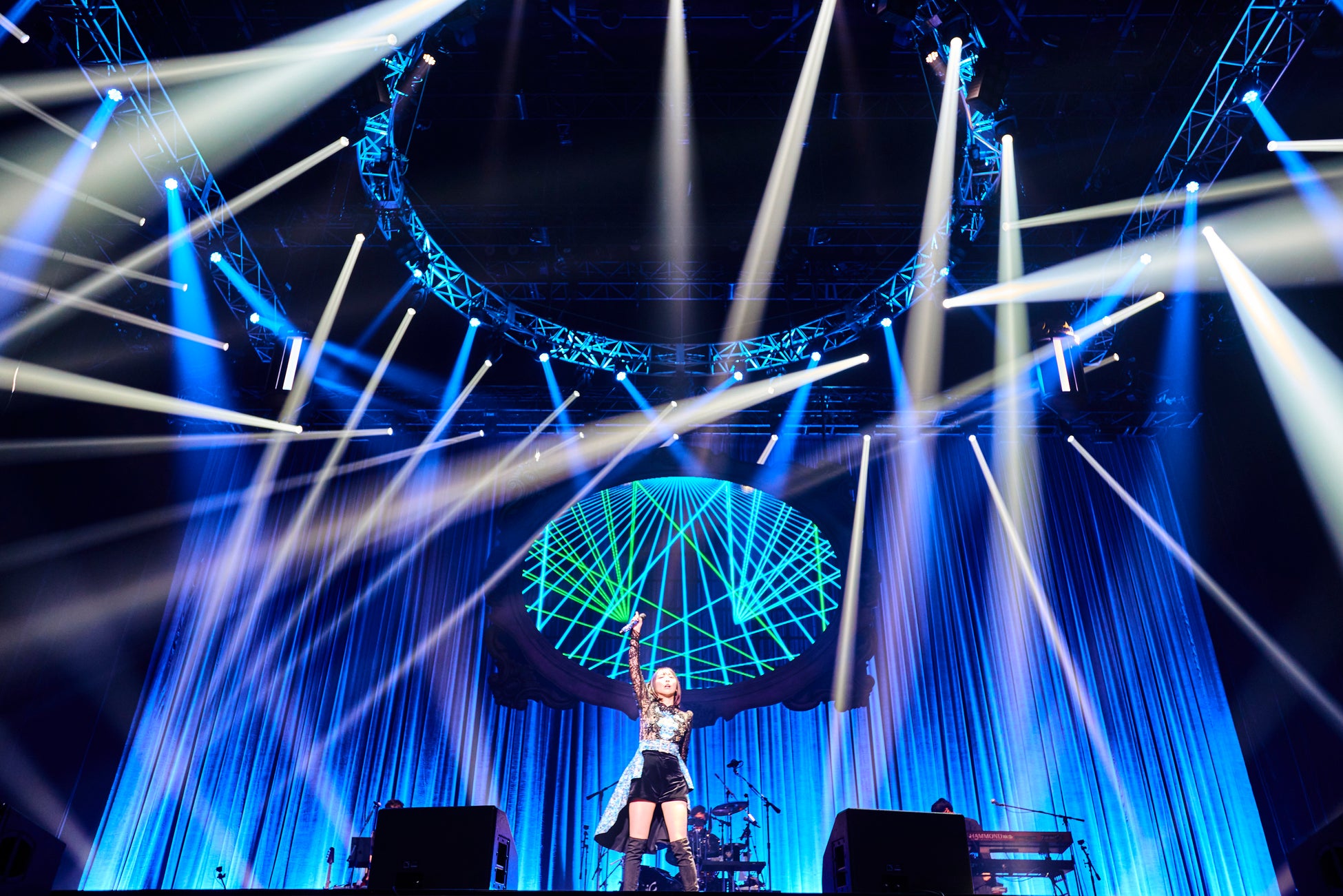 ステージ中央のモニターには、万華鏡(KALEIDOSCOPE)をモチーフにしたミステリアスなオープニング映像が流れると、本人の登場を待ちわびる来場者が、ペンライトを青一色に染め大きな拍手が沸き起こった。オープニングはメジャーデビュー曲「MEMORIA」でスタート。10年間の活動を振り返るかのように、エモーショナルに全身全霊で歌い上げる姿に、観客も思い思いに、藍井エイルの10周年に浸っている姿が非常に印象的であった。続いて、藍井エイルの音楽性を象徴する「AURORA」「シンシアの光」とロック色の強いメロディアスナンバーが続く。「横浜アリーナ『KALEIDOSCOPE』の世界へようこそ。今日は、皆さんを万華鏡の世界に迷い込ませたいと思います。」との本人MCが煽りとなり、早くも、ライブタイトル「KALEDOSCOPE」の世界へ引き込まれ、中盤へ向かって展開していくライブへの期待がさらに高まっていく。