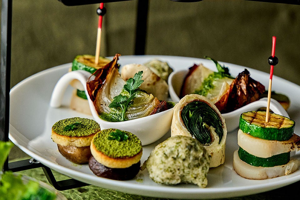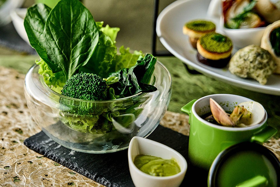セイボリーには 、新タマネギのロースト サルサベルデをご用意。新タマネギの自然な甘みと、とろけるような食感、パセリをメインにした緑の爽やかなソースで魅了します。さらに、バターの豊かな風味が加わったキノコソテーに、抹茶のほのかな香りをアクセントに加えたキノコのウィーン風は、一口ごとにその旨味をご堪能いただけます。ウェルカムプレートのサラダとスープは、神奈川県近郊の野菜を使用し、鮮やかな緑が映える一皿に仕上げました。