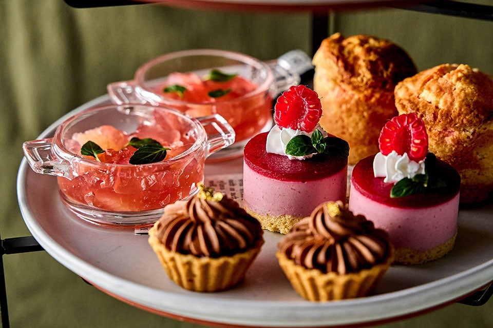 季節ごとにテーマを変えて提供しているアフタヌーンティー。今回は、抹茶のほろ苦さと、甘酸っぱいフルーツが織りなす絶妙なハーモニーが楽しめるスイーツをご用意しております 。上段に並ぶのは、川崎大師名物の久寿餅と旬の甘酸っぱい甘夏を、ほろ苦い抹茶クリームとともに贅沢に楽しめるパフェや、伊勢で収穫された香り高い抹茶をふんだんに使用したパウンドケーキ。中段には、サクサクとした食感の中に、さわやかな甘夏の香りが引き立つマーブルスコーンや、芳醇な白ワインの香りがピンクグレープフルーツの酸味と絶妙にマッチした、見た目にも華やかなゼリーが楽しめます。