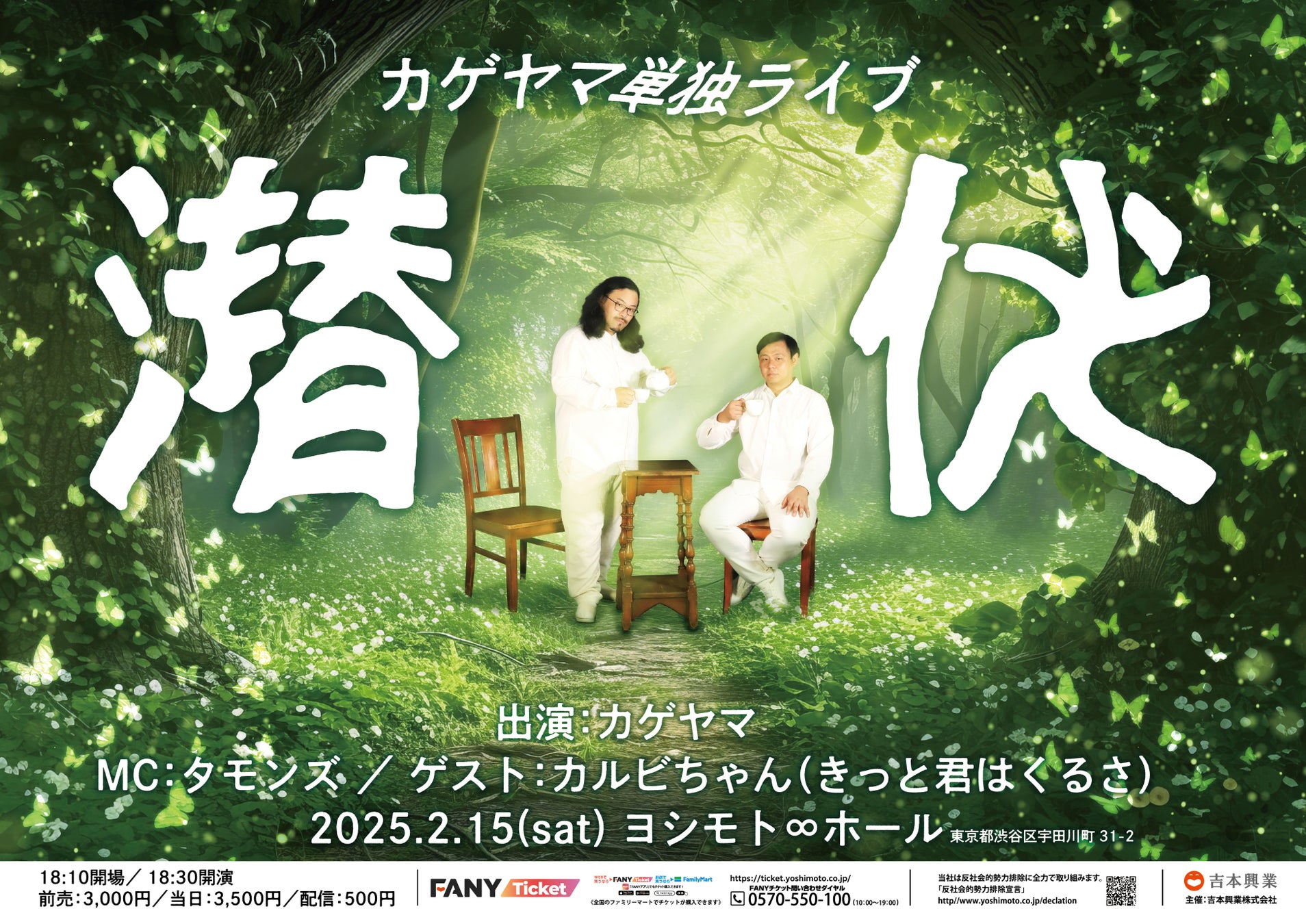 今回は配信チケットやパンフレットプレゼントも!カゲヤマ単独ライブ「潜伏」2025年2月15日(土)ヨシモト∞ホールにて開催!10月21日(月)11:00よりFANYチケット先行受付開始