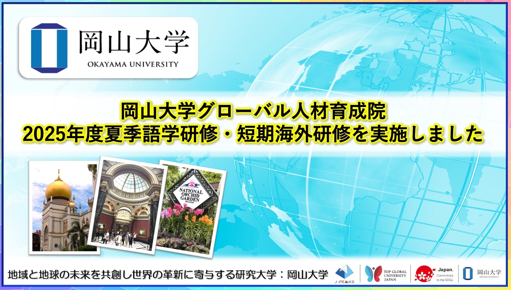 国立大学法人岡山大学(本部:岡山市北区、学長:那須保友)は、2025年8月から9月にかけてグローバル人材育成院主催の2025年度夏季語学研修・短期海外研修を実施し、参加学生が全員無事に帰国しました。今夏はシェフィールド大学(イギリス)、アデレード大学(オーストラリア)、マラヤ大学(マレーシア)での語学研修、AUN・国立六大学合同サマープログラム(タイ)と異文化体験プログラム(シンガポール)の短期海外研修が実施され、合計90人の学生が参加しました。