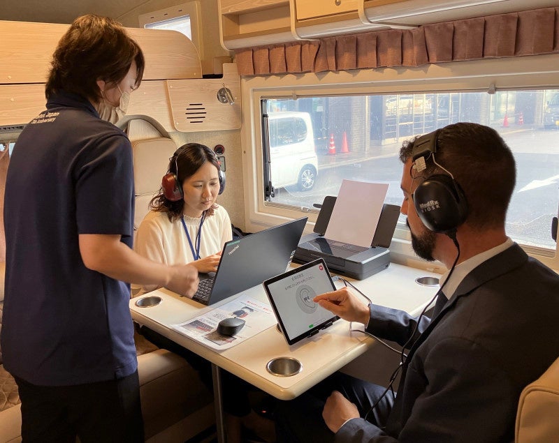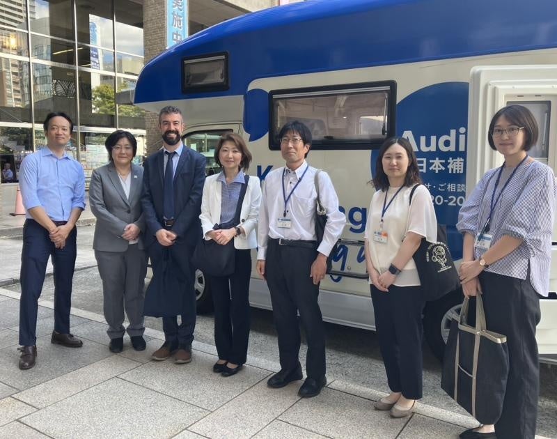 続いて岡山市役所を訪れ、同市が取り組む加齢性難聴対策について意見交換しました。世界アルツハイマーデーに合わせて同日に開催された講演会やパネル展示、加齢性難聴の早期発見・早期ケアの重要性を紹介する動画のほか、聴覚検診車「Audika Go」による検診の様子も見学し、行政の役割、企業の社会的責任、補聴器技術の将来などをテーマに岡山市、本学、企業の担当者と意見を交換しました。博士は、聴覚検診車を活用して、行政・大学・企業が連携し加齢性難聴対策に取り組む国際的にも珍しい仕組みについて、「行政・企業・大学などの公民連携(Public Private Partnership:PPP)の好事例」として高く評価し、その効果検証と今後の展開に期待を寄せました。