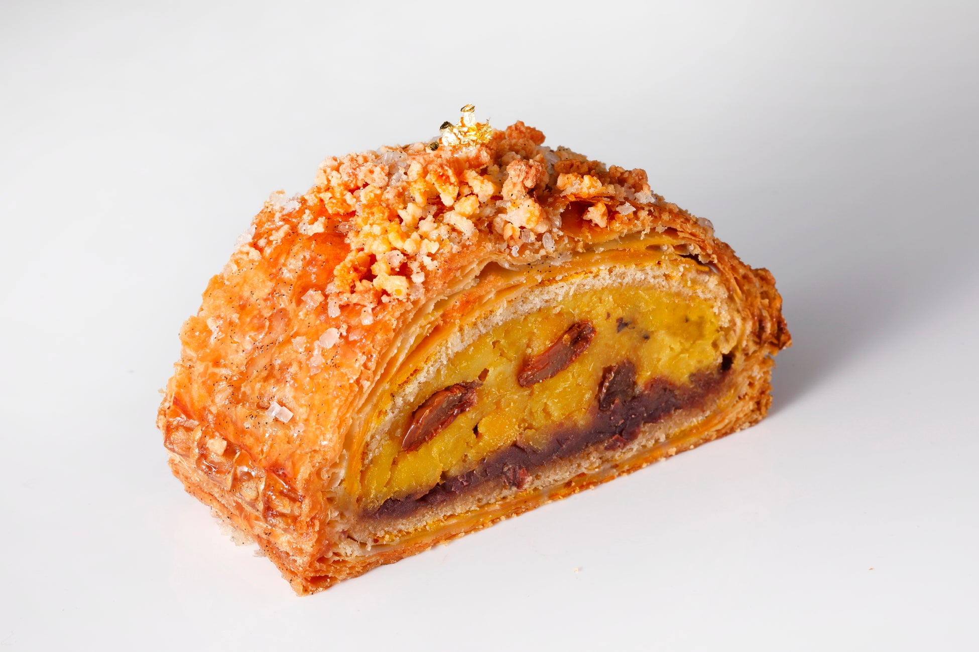 2種類の食感の異なる「鹿児島県産安納芋」を使用したスイーツが新登場。しっとりとクリーミーな安納芋にラムレーズン、黒蜜あんこ、ココナッツピューレを加え、パイ生地で包んで焼き上げました。仕上げのココナッツをアクセントに、中はしっとり、外はサクッとした食感をお愉しみください。
