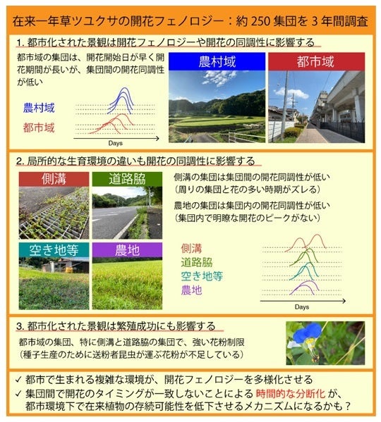 都市環境下では集団間の開花同調性が低い(各集団の開花時期がズレやすい)ことを明らかにし、都市化が植物の存続可能性を低下させる新たなメカニズムとして、‘開花フェノロジーの変化を介した時間的な分断化’が働きうることを発見しました。