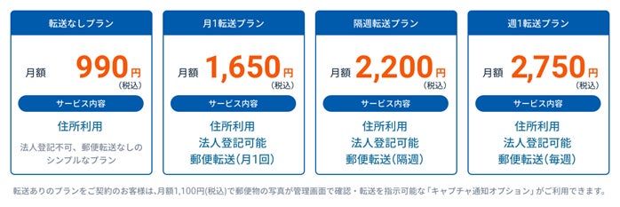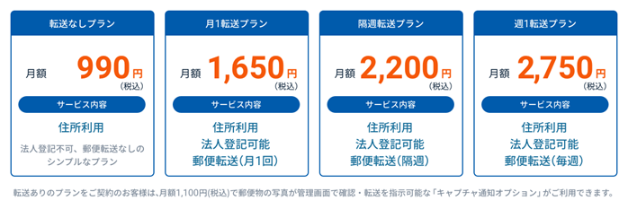バーチャルオフィス関連サービスのプランと料金は以下の通りです。