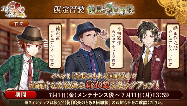さらに、イベントと同時に開催される限定召装『館長のとある回顧談』にて新規追加された「徳永直」「幸田露伴」「織田作之助」の〈カジュアルスーツ衣装〉を編成すると、得点の獲得率がそれぞれ30%上昇します。