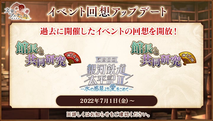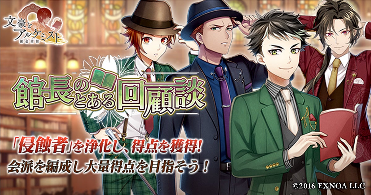 合同会社EXNOA(本社:東京都港区、CEO:村中 悠介、URL:https://games.dmm.com/)が運営するDMM GAMESは、7月1日(金)より、女性向け文豪転生シミュレーションゲーム「文豪とアルケミスト」において、イベント『調査任務「館長のとある回顧談」』と限定召装『館長のとある回顧談』を開催いたしました。
