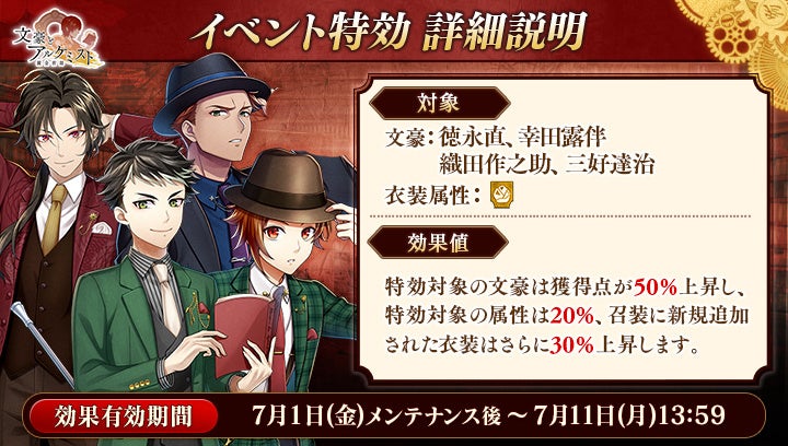 期間中「徳永直」「幸田露伴」「織田作之助」「三好達治」の衣装を編成して潜書すると、得点の獲得数がそれぞれ50%上昇します。また、「土」属性の衣装を編成して潜書すると、得点の獲得数がそれぞれ20%上昇します。