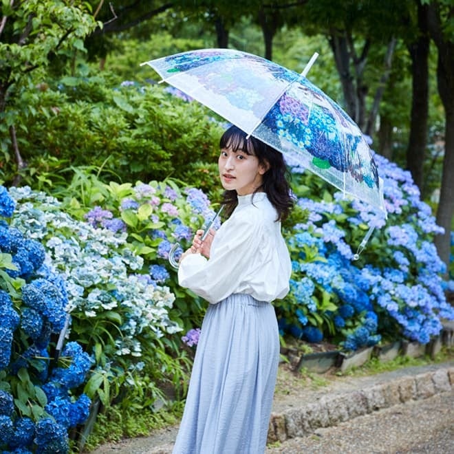雨の日を美しいグラデーションで彩る紫陽花を、空いっぱいに広げて思う存分堪能できる傘です。繊細で、ていねいに描かれた紫陽花のリアルなイラストを透明傘にのせているので、外から見れば紫陽花の花束のよう。内側から見上げれば、まるで紫陽花が空から咲きこぼれてくるような気分が味わえます。