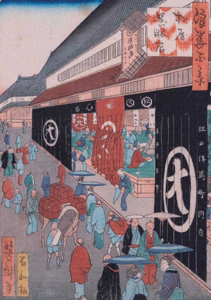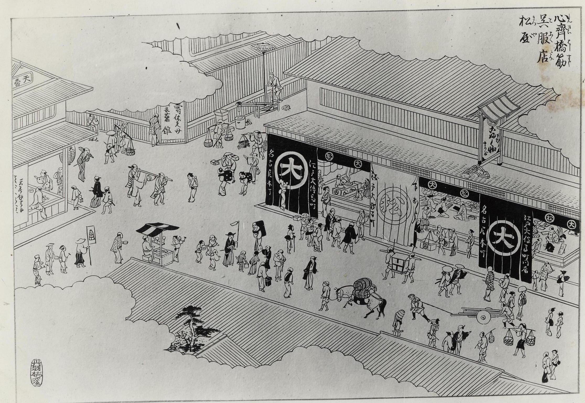 現在の心斎橋筋と清水町通り交差点の北西側に、間口一間の呉服店「松屋」を開き、当時呉服商で一般的だった掛売ではなく、現金正札販売を始めました。1837年(天保8年)大阪で大塩の乱が起こった際には、 「大丸は義商なり、犯すなかれ」と大塩平八郎が命じたとされ、大丸は焼き討ちを免れます。