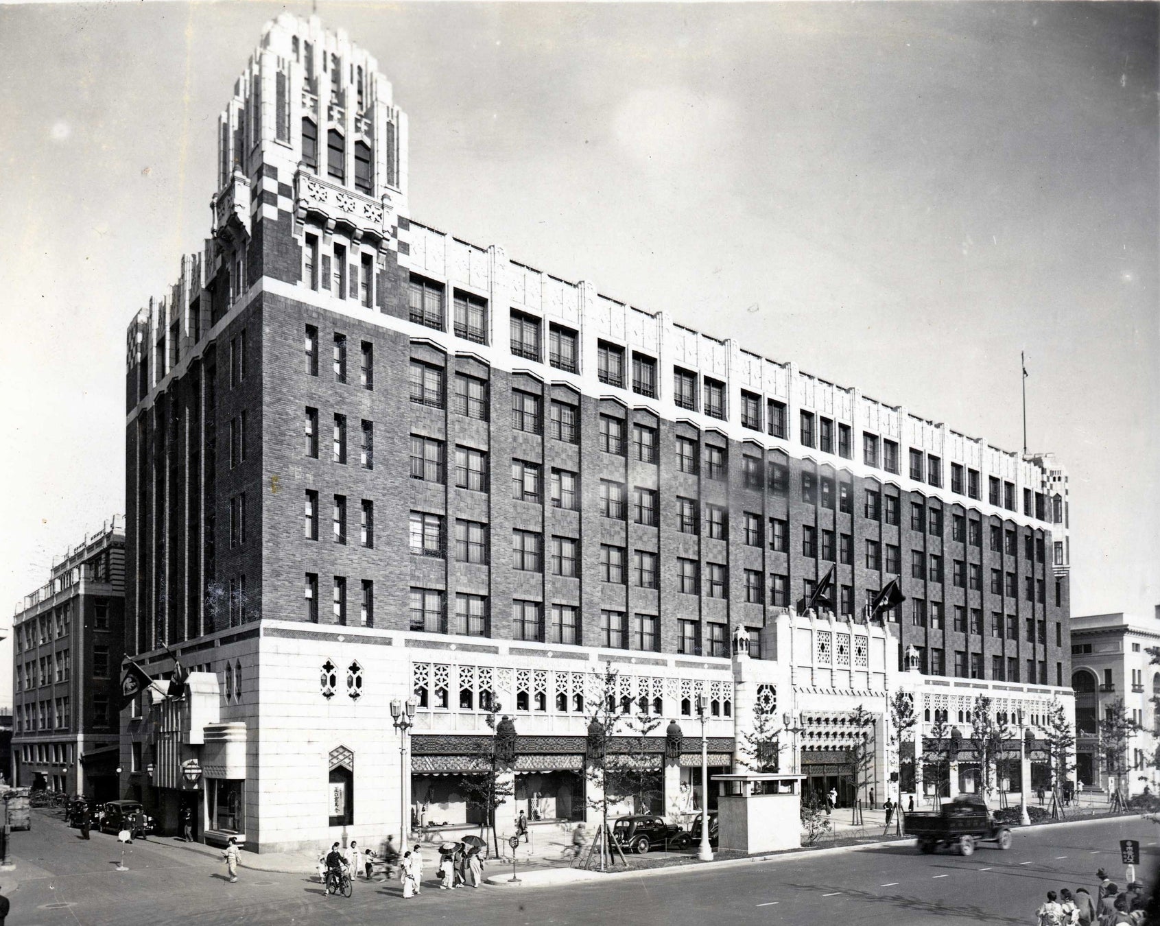 建築家ヴォーリズが設計した館が1918年に開業するも、2年足らずで失火により焼失。再起をかけ、1922年より約11年・第4期にわたる工事が完了し、御堂筋の拡幅と地下鉄開通に合わせオープンしました。翌年の1934年には、当時として画期的な全館冷暖房を導入しました。
