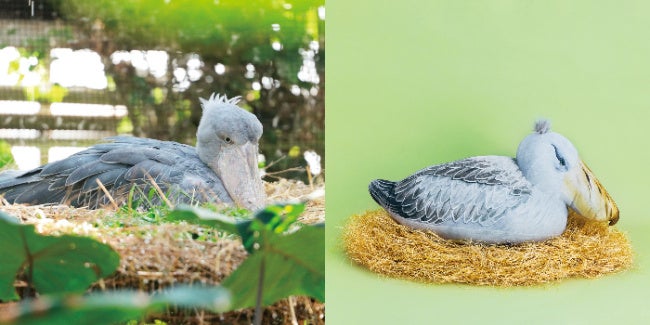 動かないことで有名なハシビロコウ。そんな彼らがアヒルのように脚を折りたたんで休憩している、ふだんのキリッとした立ち姿とのギャップを感じる、なんとも愛らしい姿を再現しています。