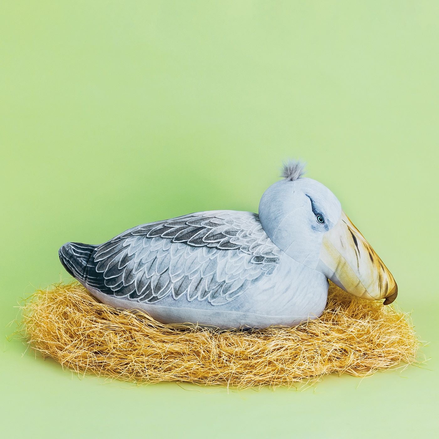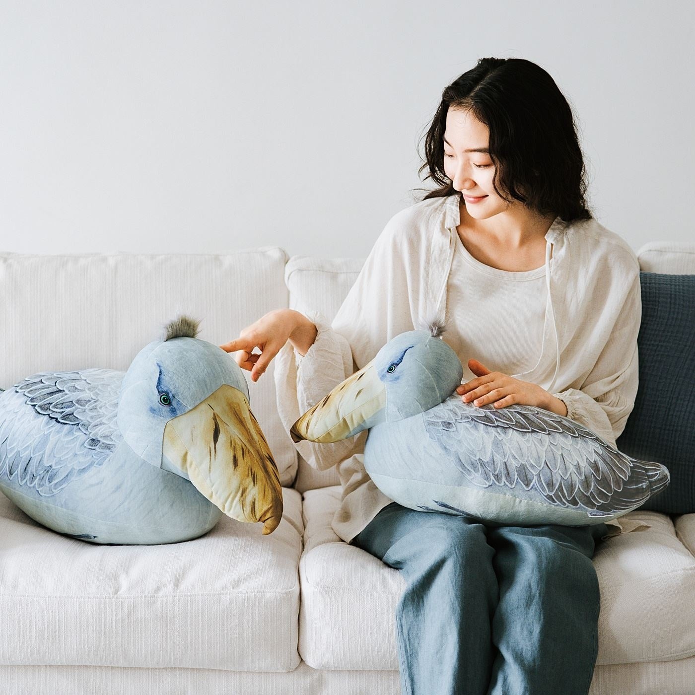 〈BIGサイズ〉は抱きしめがいのあるボリューム感◎。ソファやベッドに置いておいても、まるで本物のハシビロコウがそこにいるような存在感があるのが魅力。
