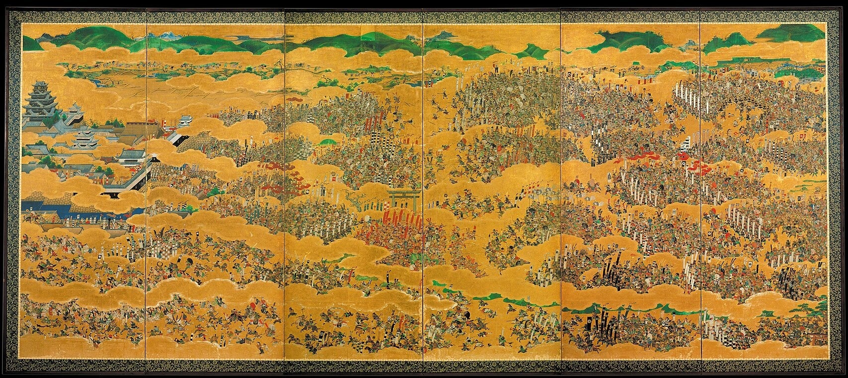 『大坂夏の陣図屏風』 重文、江戸時代(17世紀)。武将の黒田長政が大坂の陣の戦勝祝いとして描かせた六曲一双の屏風。左端に漆黒の大天守が威容を誇る。鉄壁の大坂城も、平地の城ゆえ外堀を埋められると “裸の城” となる。落城した慶長20年(1615)5月7日の大坂城を描いたとされる。大阪城天守閣蔵