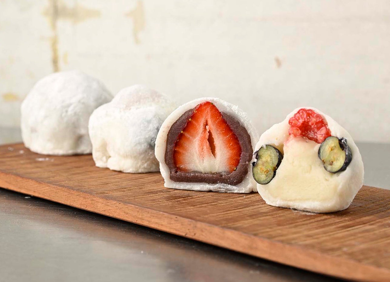 翠江堂本店(東京・八丁堀)の「苺大福」(断面左)と、ブルーベリーとラズベリーを使い、餡にマスカルポーネを練り込んだ「マスカルポーネベリー大福」(断面右)。モルトウイスキーにも合うという。ともに1個300円。