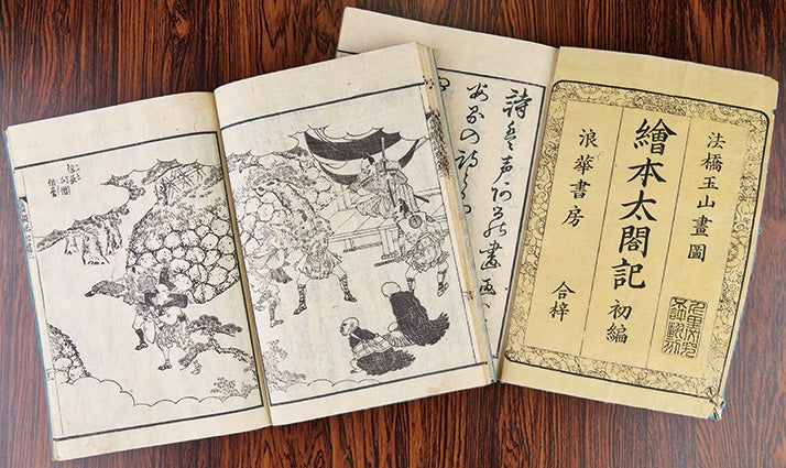 『絵本太閤記』 講談本が基になっており、秀吉が信長の草履を懐に入れ温めた逸話や墨俣(岐阜県)に一夜で城を築いた伝説ほか、天下取りまでの痛快なストーリーが岡田玉山の挿絵で展開する。江戸後期に出版されたこの書物により、秀吉のイメージが庶民に定着したという。