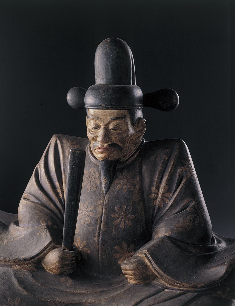 『豊臣秀吉木像』 秀吉没後間もなくの制作とされ、最晩年の姿を伝える唯一の木像。中国・明から贈られた唐冠をかぶり手に笏を持つ。大阪城天守閣蔵