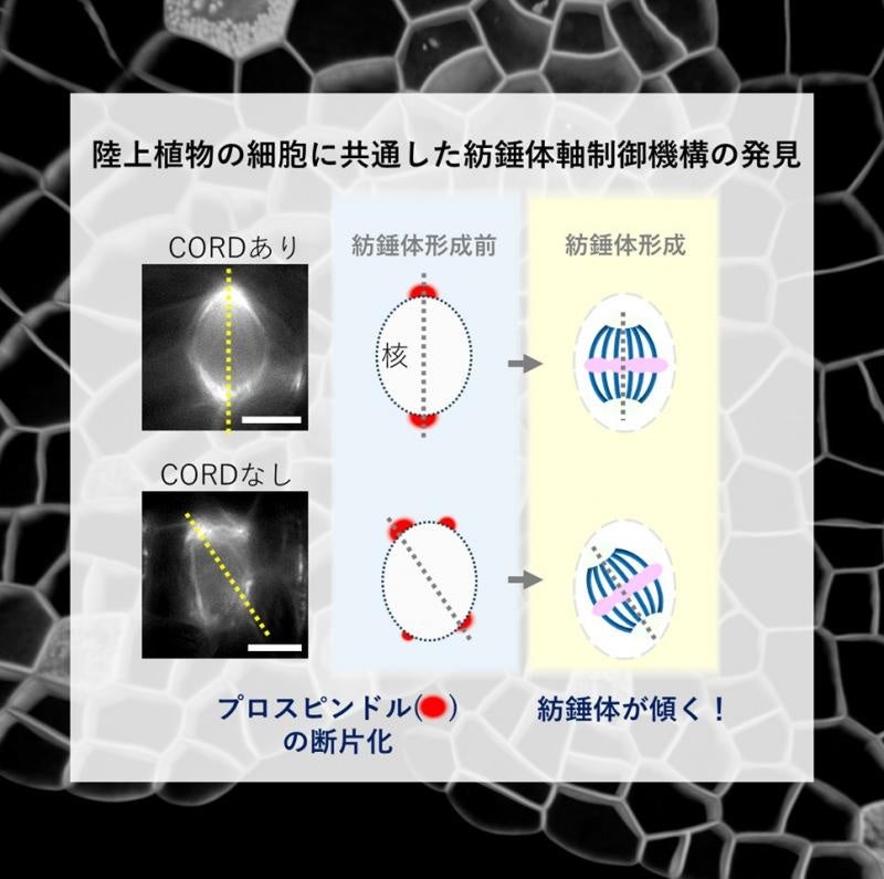 研究グループは、基部陸上植物のゼニゴケと被子植物のシロイヌナズナを用いて、細胞分裂時に発現するCORD遺伝子の働きを解析しました。その結果、CORD遺伝子が産生するタンパク質が、細胞分裂に不可欠な紡錘体の向きを安定させることで、細胞が正しい方向に分裂できるよう制御していることを発見しました。
