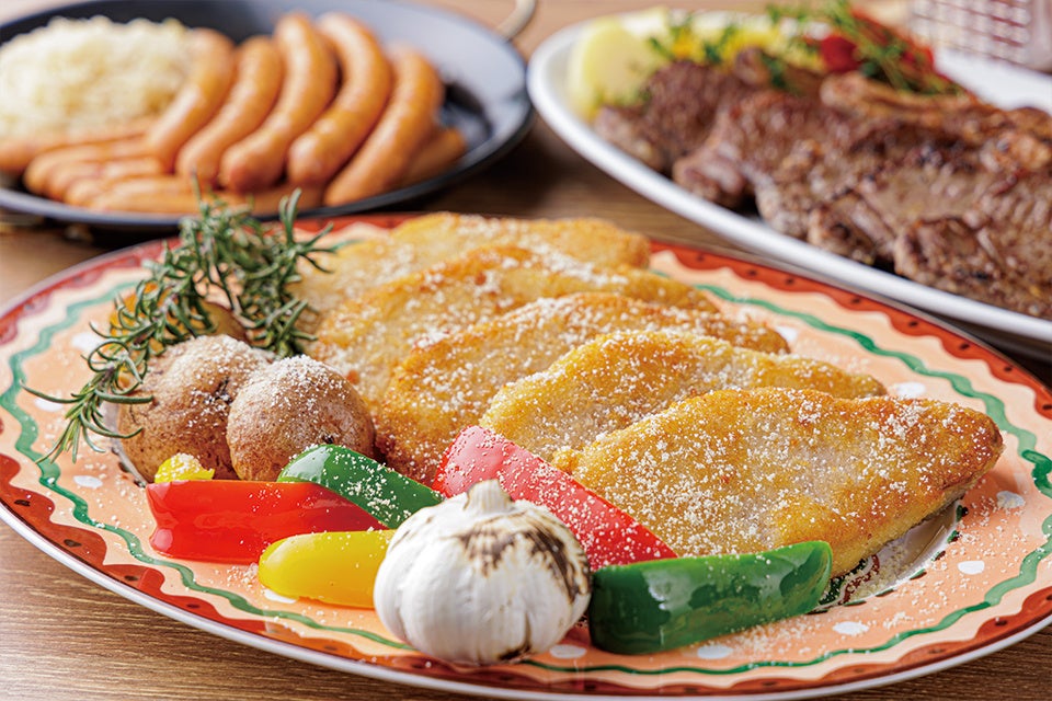 イタリアからは「ミラノ風ポークカツレツ」。きめ細かいパン粉にパルメザンチーズを混ぜた衣をつけて香ばしくカリっと焼きあげ、仕上げにバターを入れてコクと香りを引き立てます。フレッシュトマトで作った冷たいケッカソースでさっぱりとお召し上がりください。ドイツからは国民食とも言える「ソーセージ」を。約16cmのロングーセージに発酵させたキャベツの酸味が相性抜群のザワークラウトを添えて提供いたします。