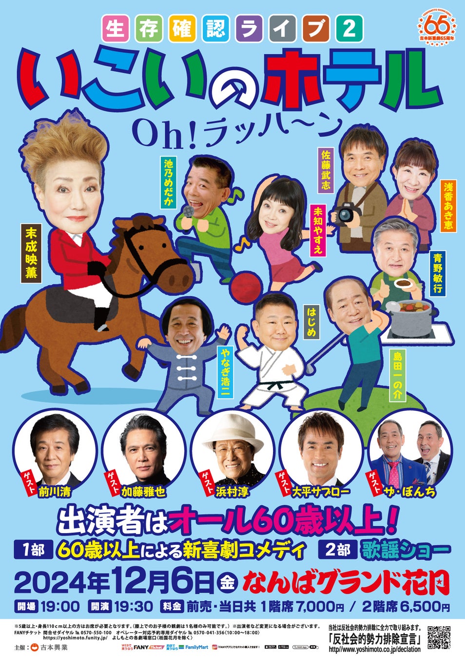 2024年12月6日(金)になんばグランド花月にて吉本新喜劇・末成映薫 主催『生存確認ライブ2~いこいのホテル Oh!ラッハ~ン~』の開催が決定いたしました。
