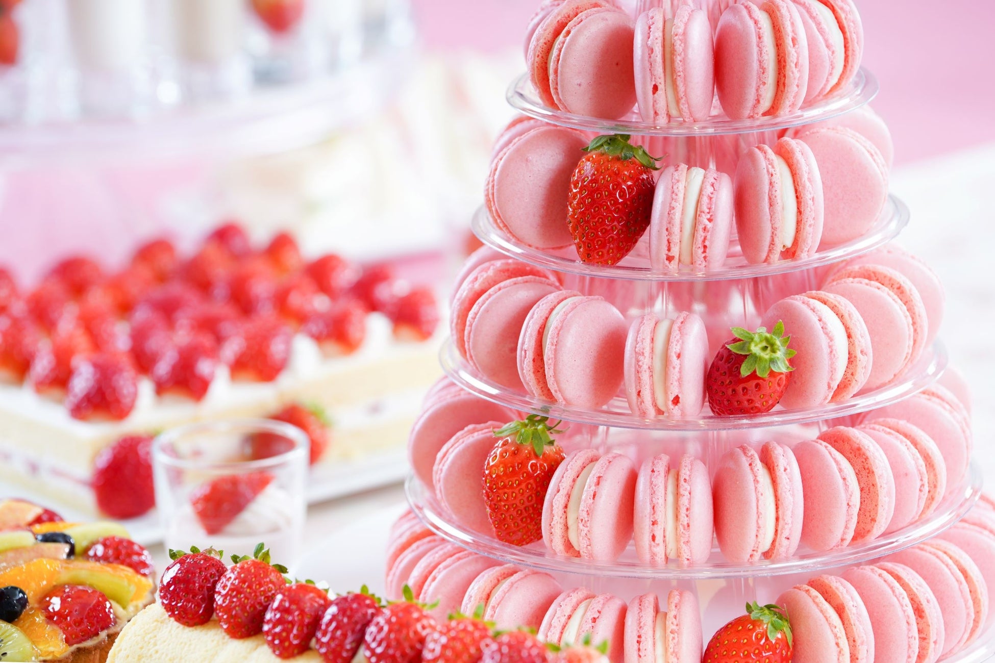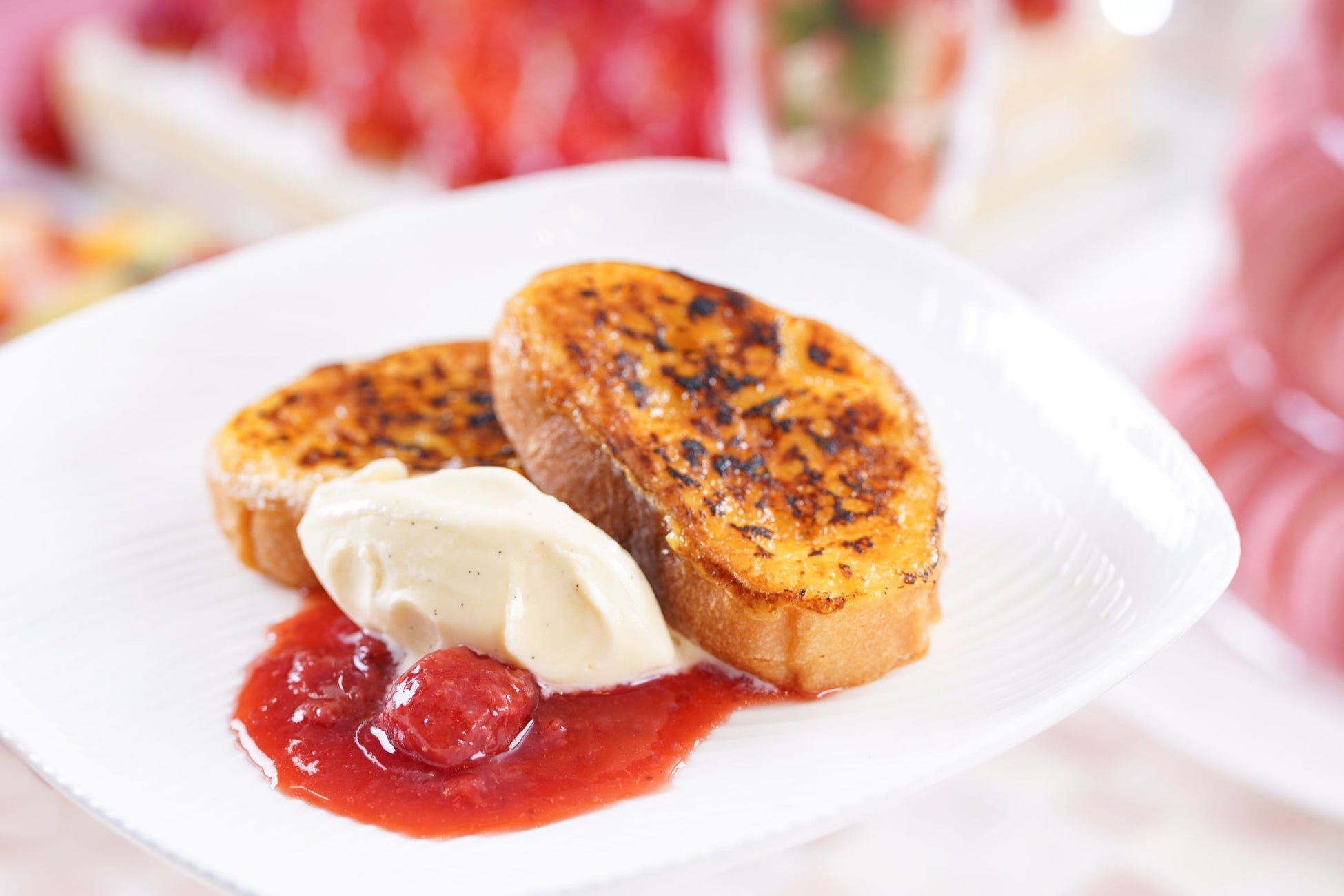 イチオシの「ブリュレフレンチトースト」は、たっぷり卵液をしみ込ませたバゲットを焼き上げ、仕上げに表面をキャラメリゼします。外側はパリッと、内側はとろけるようなふわふわ食感!バニラアイスと苺ソースを一緒に召し上がっていただくことで、甘さと酸味のバランスが絶妙な味わいです。鮮やかなピンク色の「苺のマカロン」は、軽やかな口どけでいくつでも食べられそうです。クリーミーなチーズムースを苺の形に模した「苺のレアチーズケーキ」は、見た目でも楽しめる可愛さです。この他にも「苺のショートケーキ」「苺のロールケーキ」「苺のムース」「苺のスムージー」など、苺の魅力を存分にお楽しみいただけます。