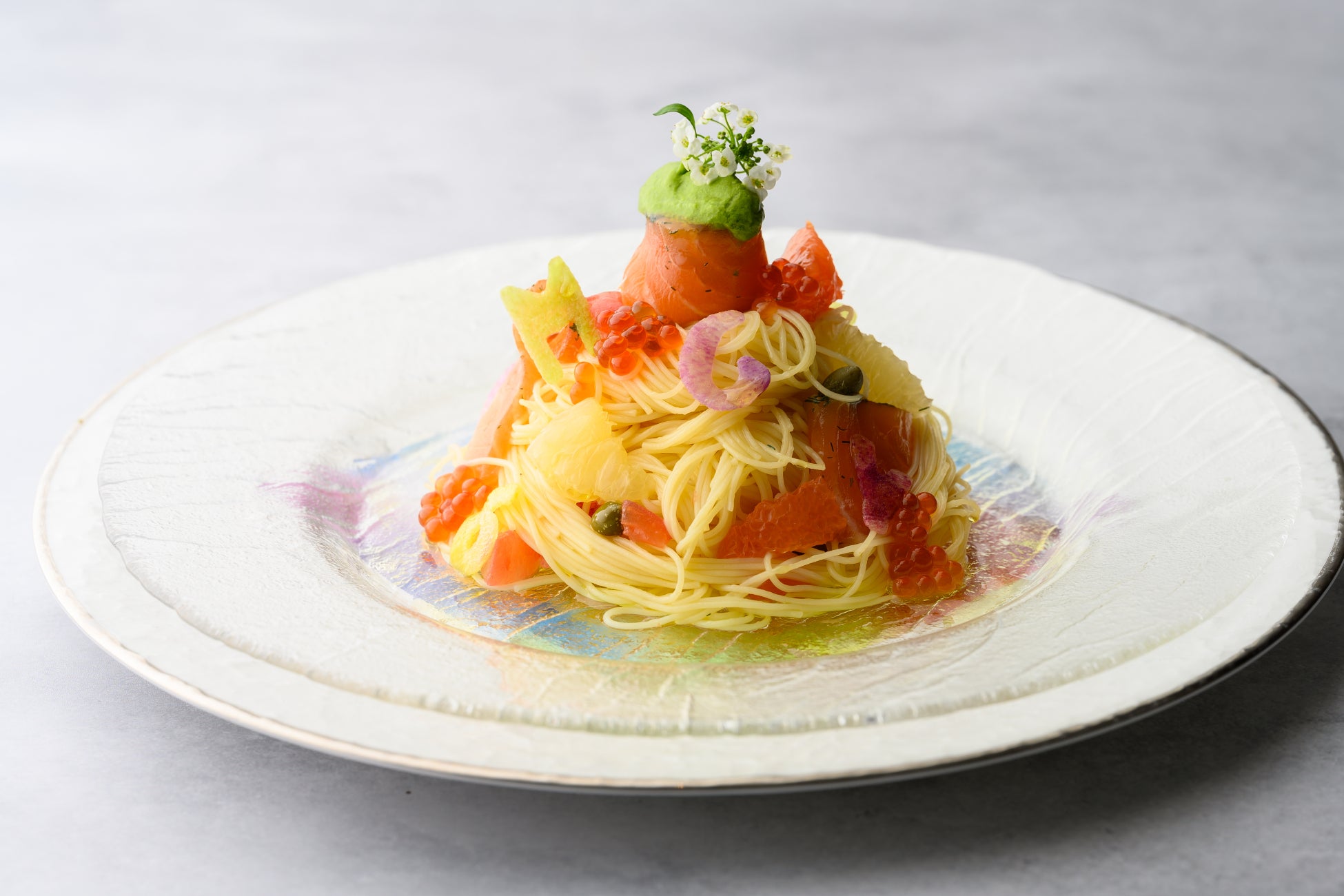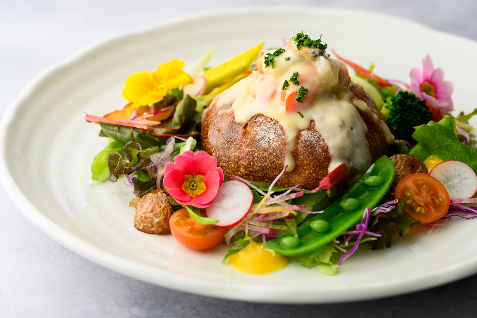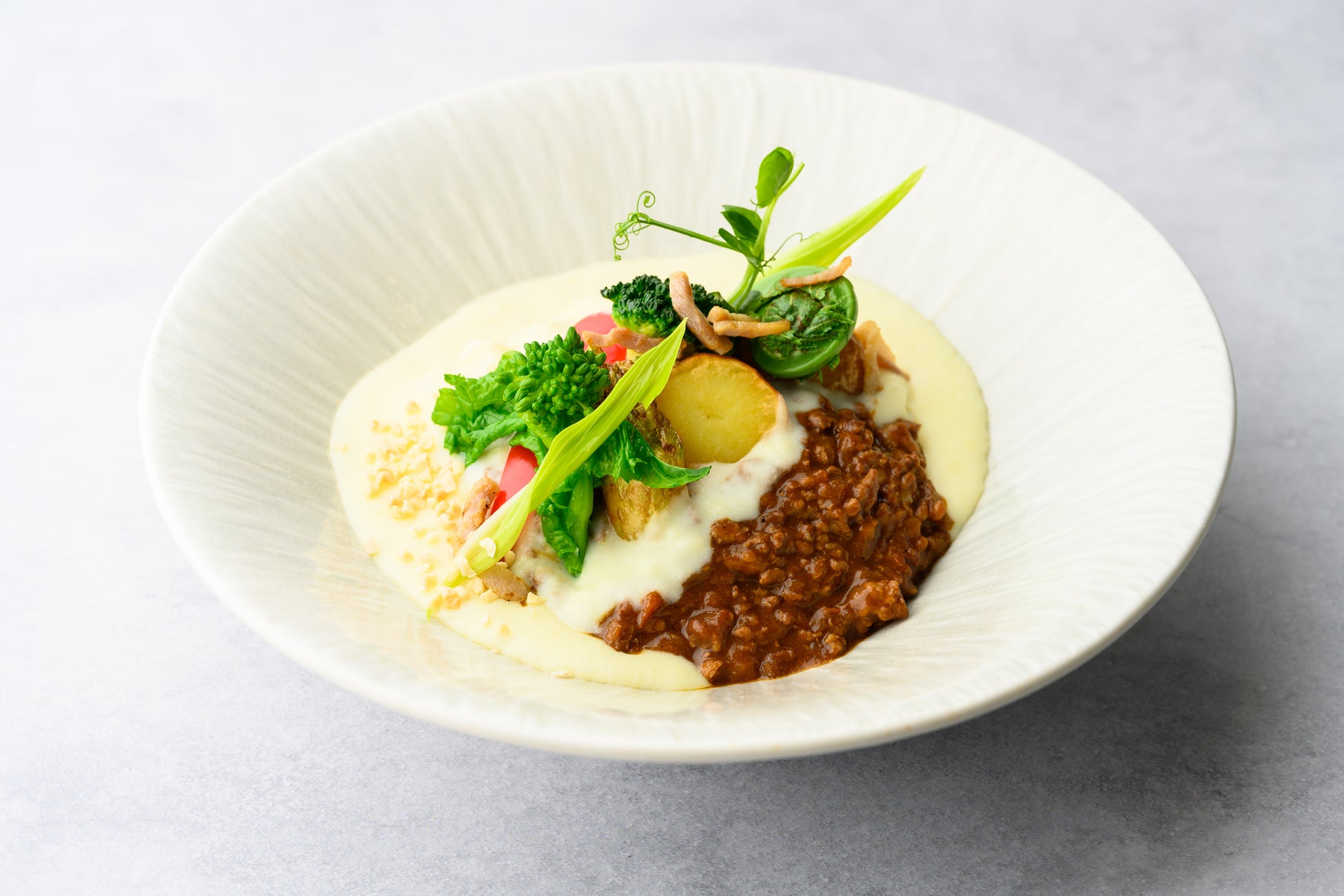 週替わりでご用意するメイン料理の中でも、能登豚のミンチとベーコンを使用したスパイス香るキーマカレーは『ほくりくアイドル部」の白と緑の制服をイメージした盛り付けにし、冷製パスタは味が締まったサーモンマリネにグレープフルーツを合わせ爽やかな酸味とフレッシュさが相まって春らしい味わいのひと皿に仕上げております。その他にも旬の春野菜や能登の野菜などを使用し、北陸の春をイメージしたメニューを揃えました。