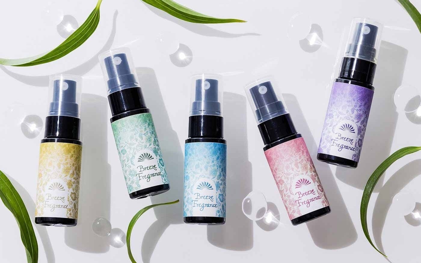 香りは、〈きよらか(木蓮の香り)〉〈なごやか(桜の香り)〉〈たおやか(白檀の香り)〉〈かろやか(檜の香り)〉〈さわやか(青柳の香り)〉の全5種類。宝相華をデザインしたボトルに入っています。