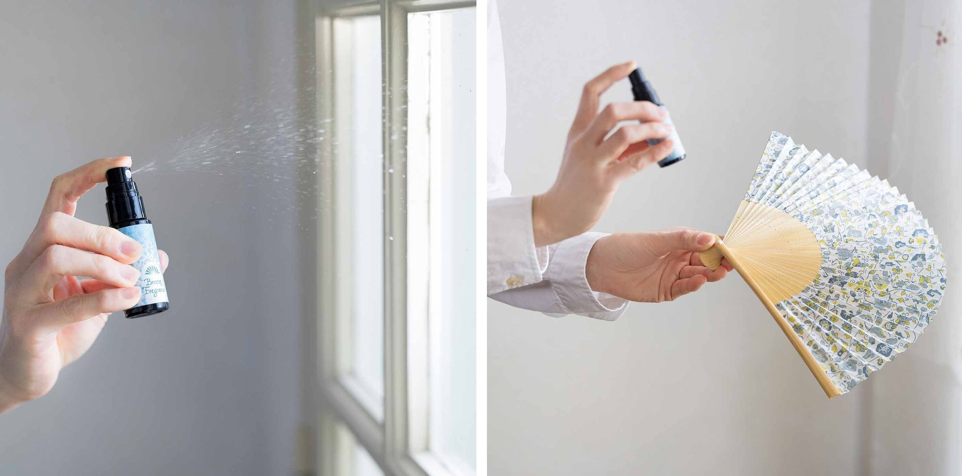 空間にスプレーして香りづけるのがポイントです。お手持ちのうちわやカーテンや服につけても癒やしの香りを楽しむことができます。