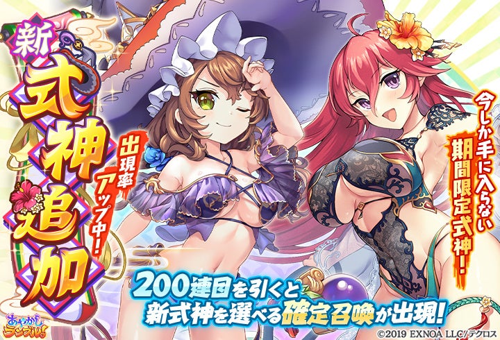 あやかし美少女RPG!DMM GAMES『あやかしランブル!』にて、水着姿の「★5メグ」「★5ヒエン」が追加!さらに「★5式神確定召喚券」が手に入るログインボーナスも開催!