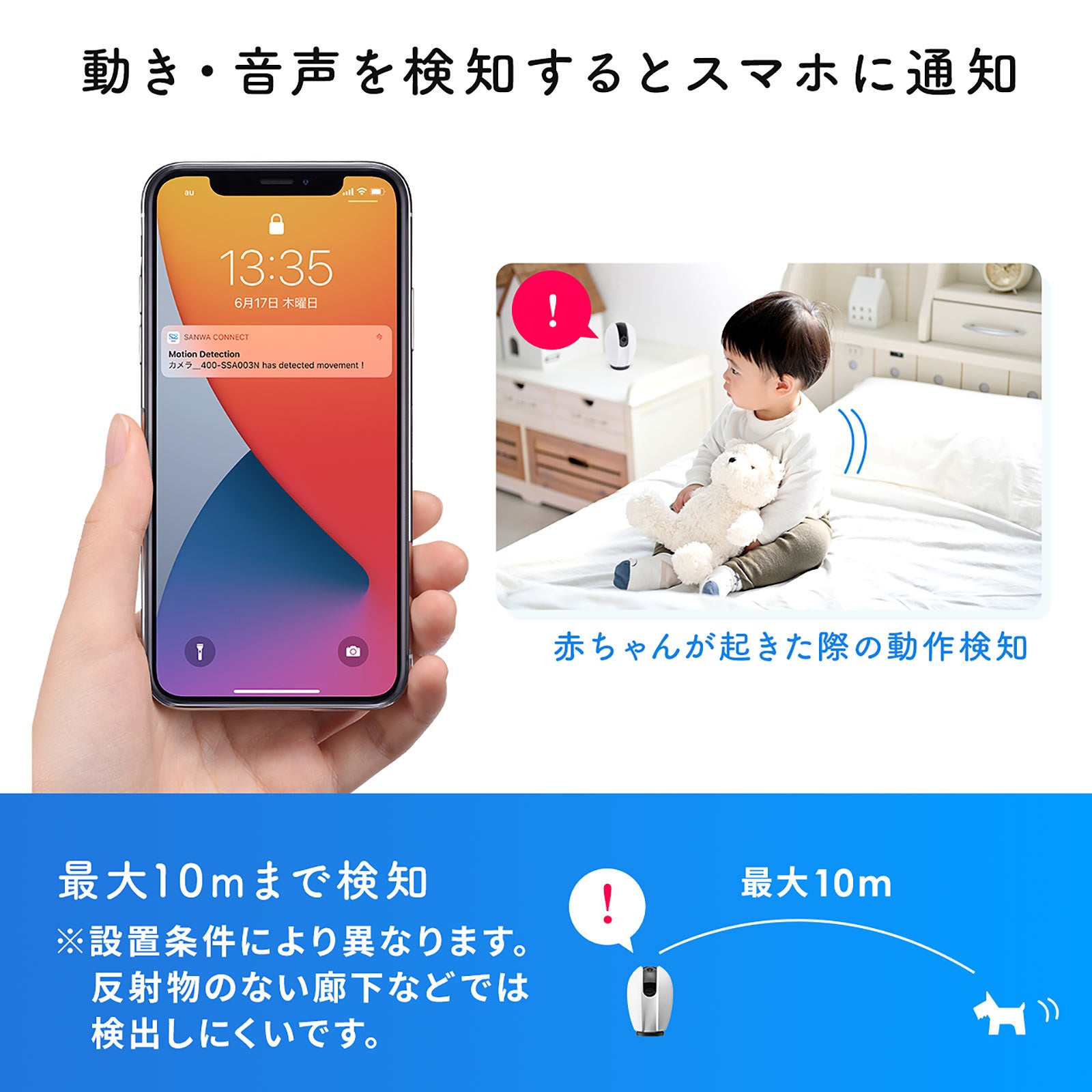 サンワサプライ株式会社(本社:岡山市北区田町1-10-1、 代表取締役社長 山田 和範)が運営している直販サイト『サンワダイレクト』では、自動追尾機能搭載で赤ちゃんの見守りのベビーカメラや、ペットの様子を確認するペットカメラ、空き巣対策の防犯カメラとしておすすめなWi-Fi接続で外出先でもスマホで家の様子を確認できる屋内用ネットワークカメラ「400-SSA003N」を発売しました。