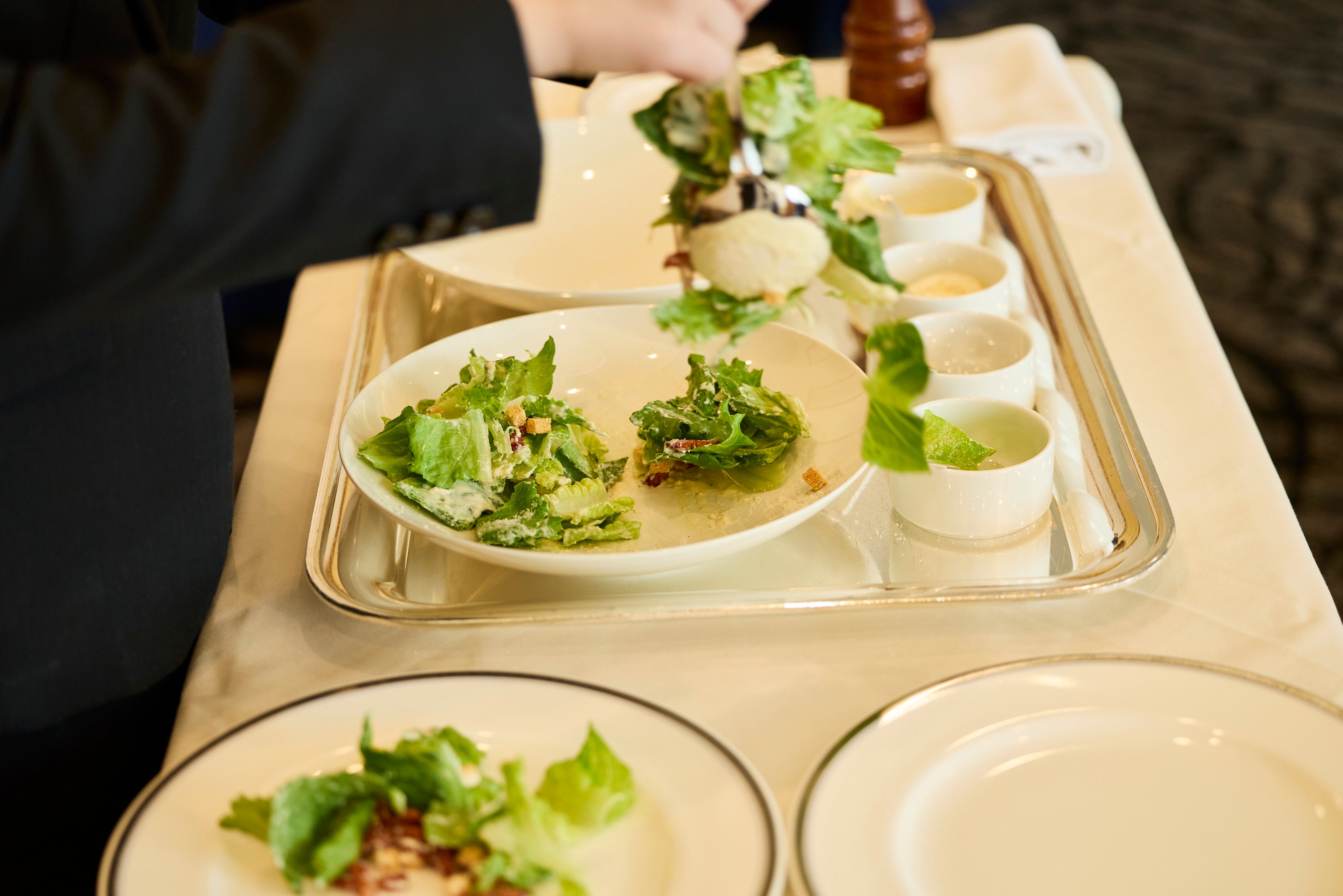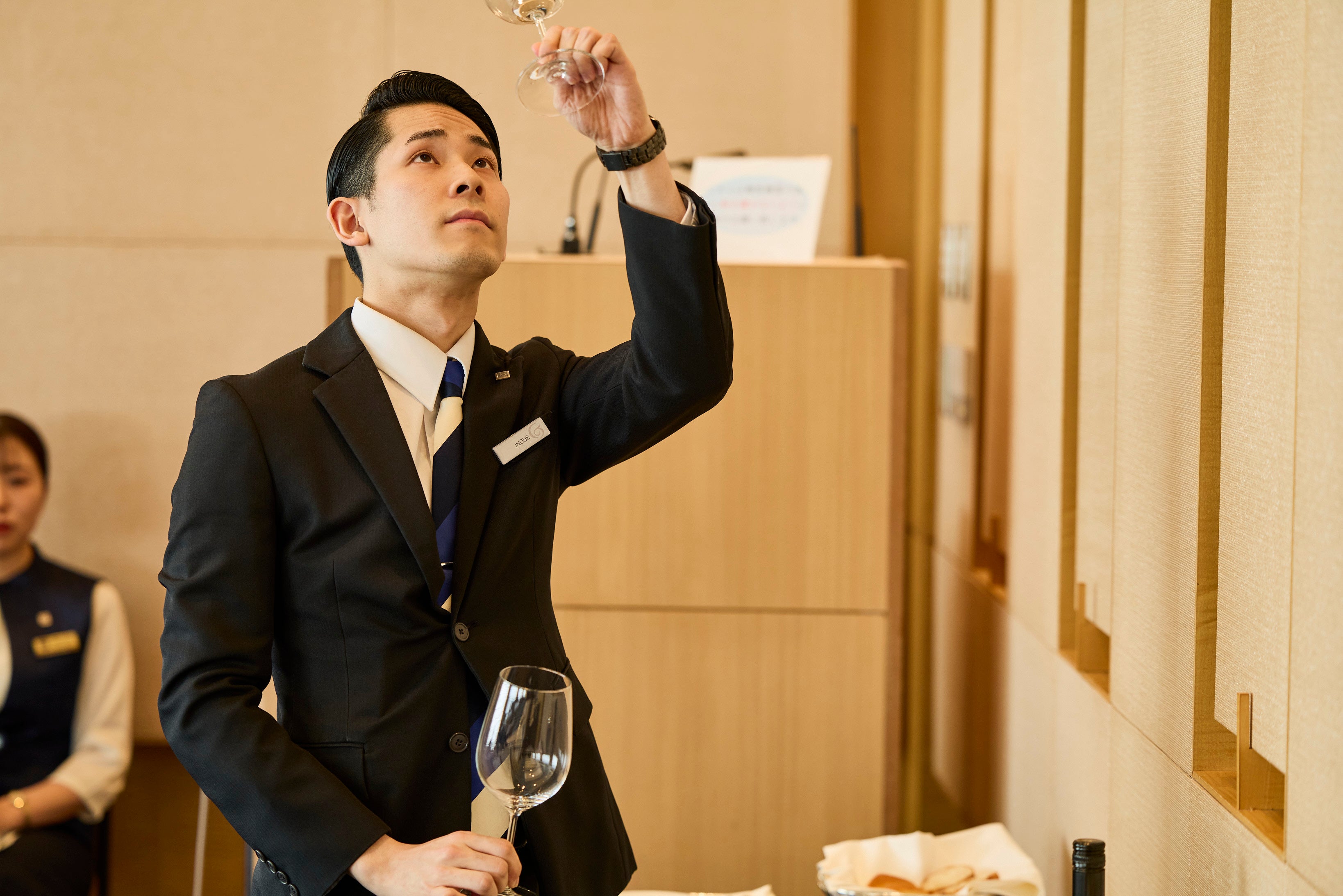 ②予選 全34名参加。職場の友人とのビジネスランチでクイックサービスを希望、1名はエビ・カニアレルギーがあるという設定。テーブルセッティングから始まり、ゲストのお出迎え、メニュー提示、オーダー、技術力としてシーザーサラダのワゴンサービス、ワインやパンなどのサービス力など、全7項目が設定され、これらを制限時間内に行う。
