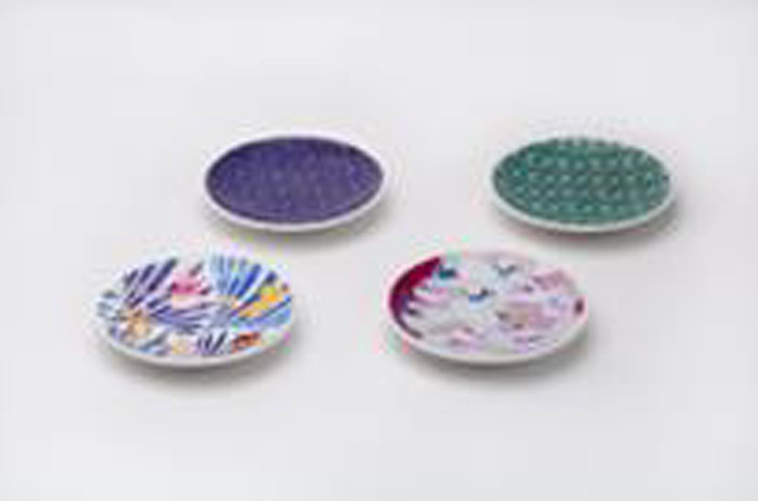 小宮康義の〈江戸小紋着尺〉、水橋さおりの〈友禅訪問着「群」〉、城間栄市の〈琉球紅型着物「島ツナギ」〉の図柄の一部を配置しプリントした豆皿。