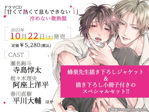 蜂巣先生原作の大人気BLコミックス ドラマCD「甘くて熱くて息もできない 1」冷めない微熱盤の描き下ろしドラマCDジャケットを公開!