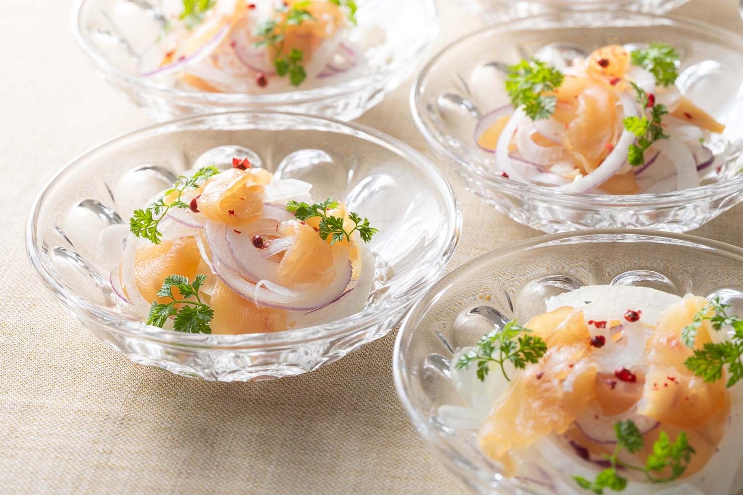 はかた地どりの生ハムとオニオン マスタードソースで召し上がれ