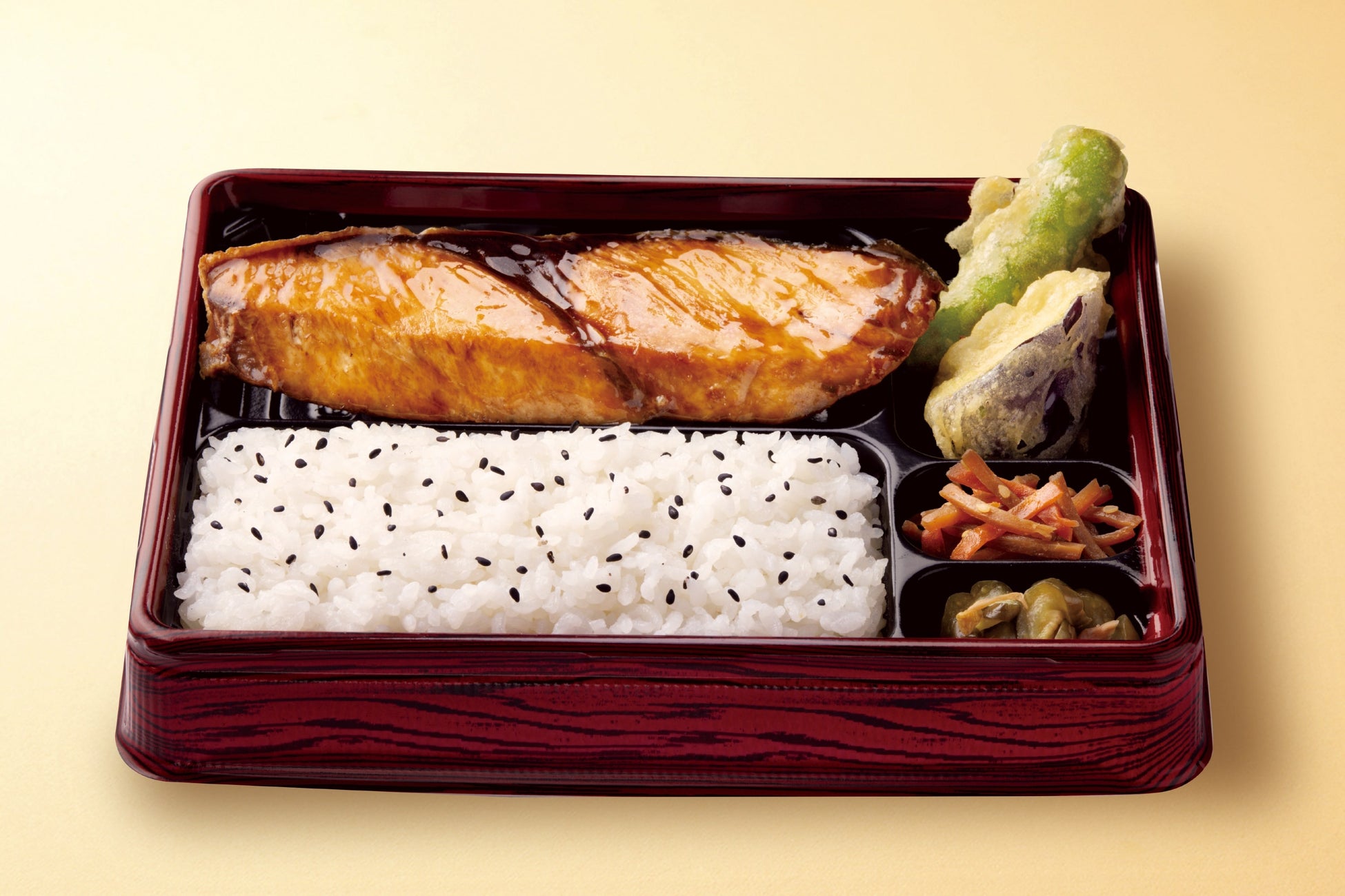 天然ぶりの特徴である引き締まった身の旨味を楽しめます。濃厚な甘みとコクが豊かで香ばし醤油の香りが特徴の照り焼きタレで仕上げました。脇を固めるのは、なすやししとうの天ぷら、きんぴらごぼう、しば漬けと箸休めにピッタリです。