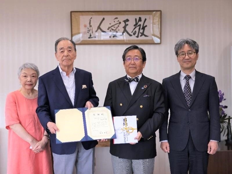 国立大学法人岡山大学(本部:岡山市北区、学長:那須保友)の岡山大学病院は、株式会社第一エンタープライズ様より、岡山大学病院の「想い虹」基金へのご寄付を賜りました。これに伴い、2025年9月24日、本学津島キャンパスの学⻑室において形⼭舜⽌郎代表取締役と奥様のほか、関係の皆さまご臨席のもと、目録の贈呈式を執り行いました。