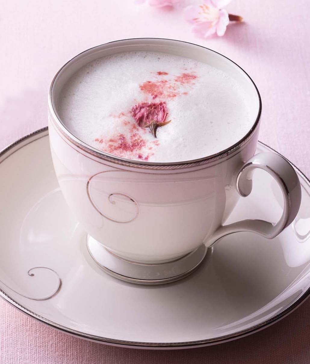 桜色のミルクをベースに、ホイップクリームと桜パウダー、塩漬けした桜をのせた「アイスさくらラテ」は、甘酸っぱいチェリーの風味をほのかに感じられる一杯。ホイップクリームを馴染ませるように、お好みで混ぜ合わせながらお召し上がりください。また、寒い日には「ホットさくらラテ」がおすすめ。ふわふわのフォームミルクで仕上げたカフェラテに、桜パウダーと塩漬けした桜をのせました。ゆっくり溶けてゆく塩味がアクセントになった、心も体も温まる一杯です。