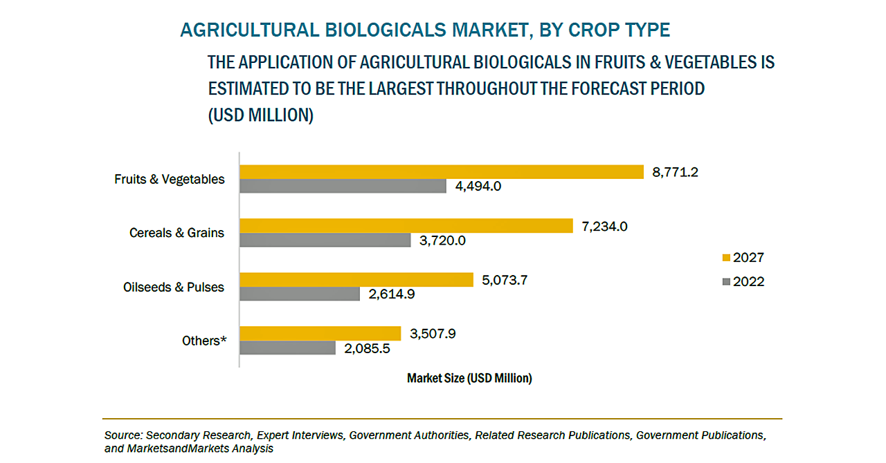 農業用生物製剤の市場規模は、2022年の129億米ドルからCAGR13.7%で成長し、2027年には246億米ドルに達すると予測されています。有機農業への取り組みと環境保護への意識の高まりが、農業分野における生物製剤の需要を後押ししています。化学薬品を使用する事による土壌の悪化、生産性の低下、害虫の蔓延といった要因が、作物保護および作物強化のための生物製剤市場の成長を促しています。