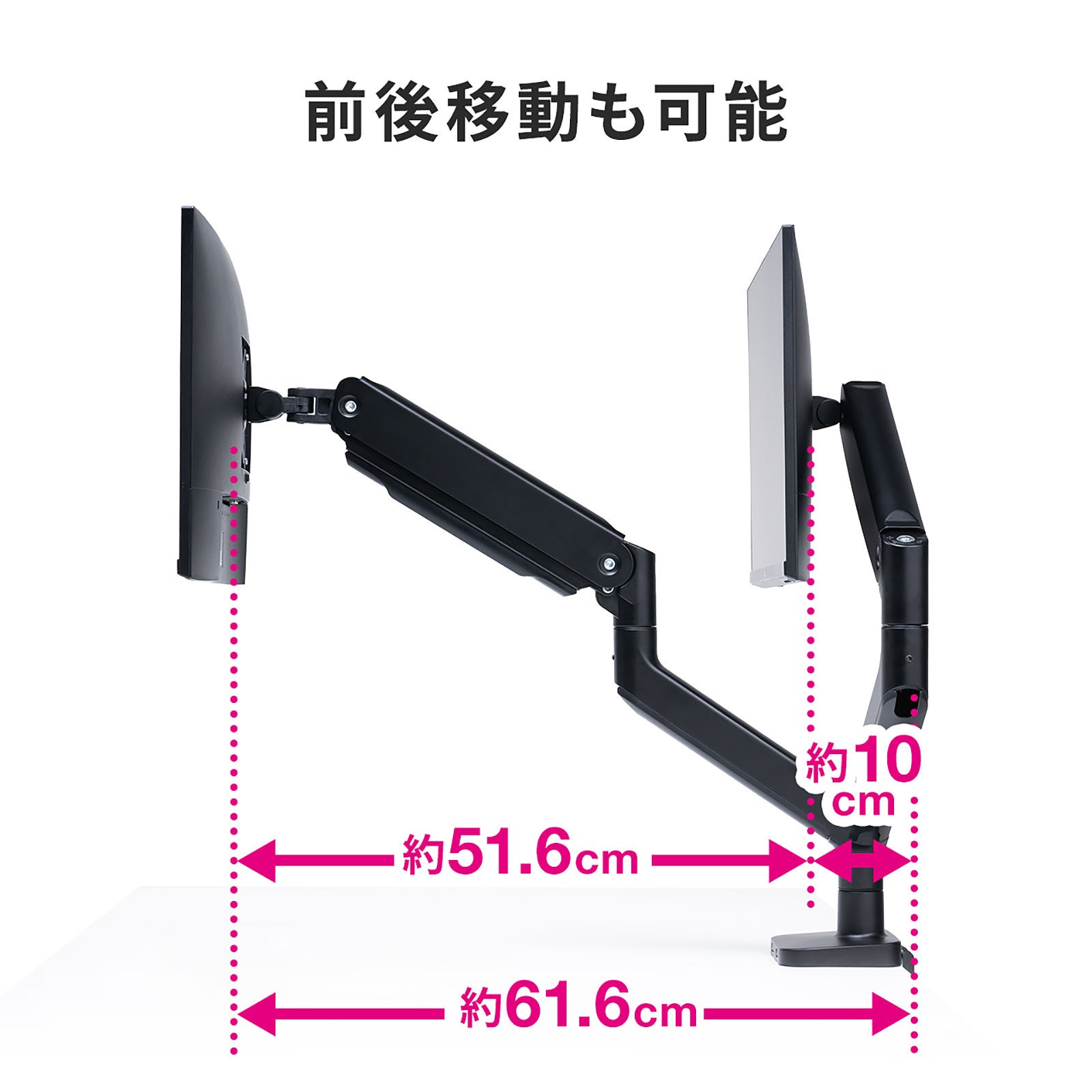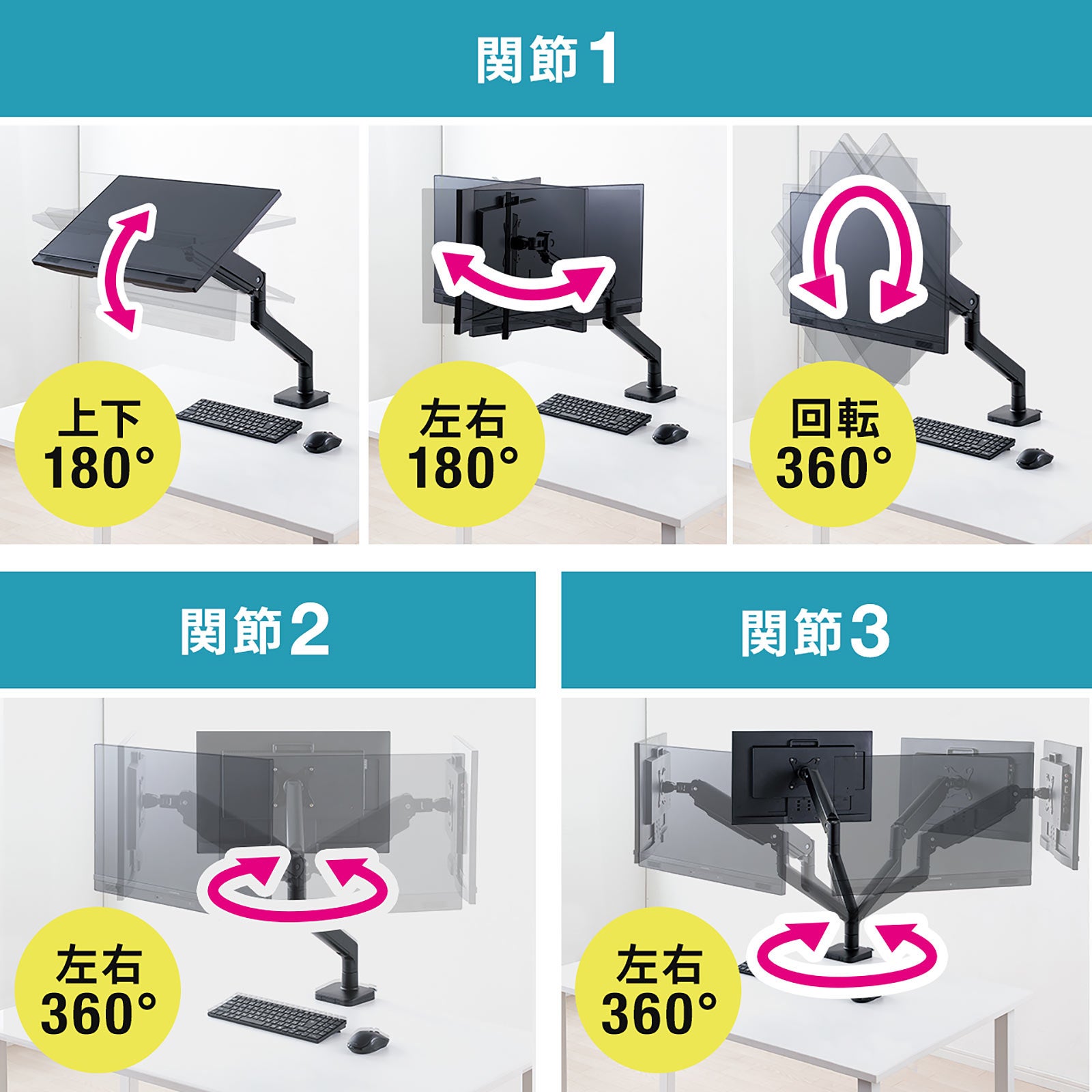 本製品は、水平空間に対して大きく伸縮する3関節のモニターアームです。